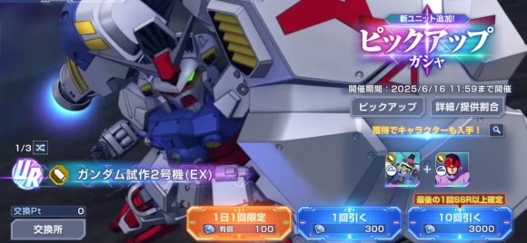 ガンダム試作2号機ガシャは、アタッカー不足なら引くべきガシャです。中でも試作2号機は、ライバルタグを持つURユニットであり、POWER7,200と破格の威力を誇るマップ兵器を持つため、周回はもちろんエターナルロード攻略でも活躍します。
