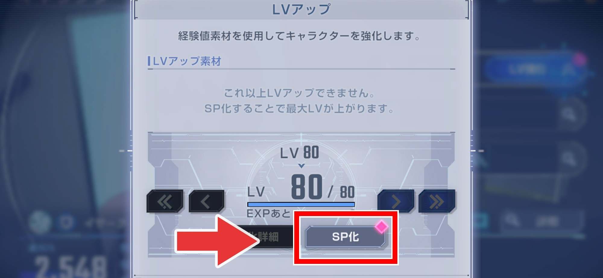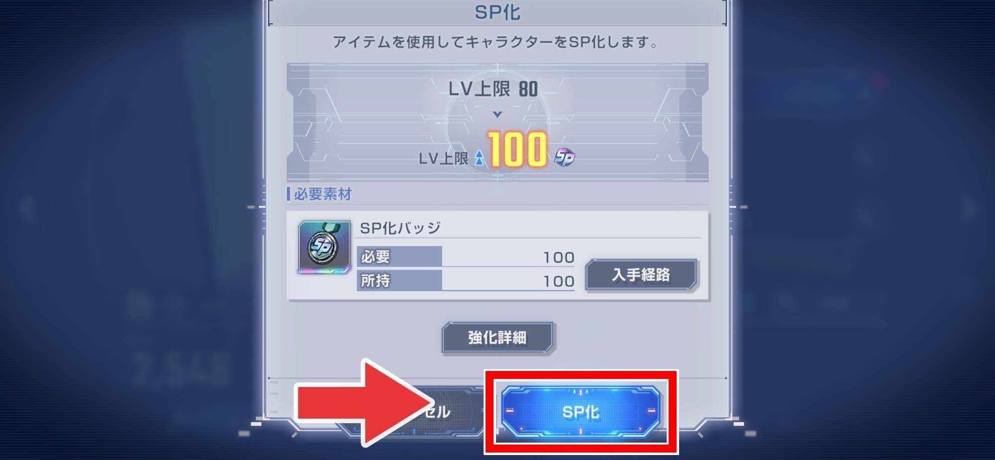 SP化は、SSR以下キャラクターのレベル上限が100まで上昇するのがメリットです。レベル上限が上がるとステータスが大きく底上げされるため、与ダメージや命中率アップ、被ダメージ軽減に直結します。