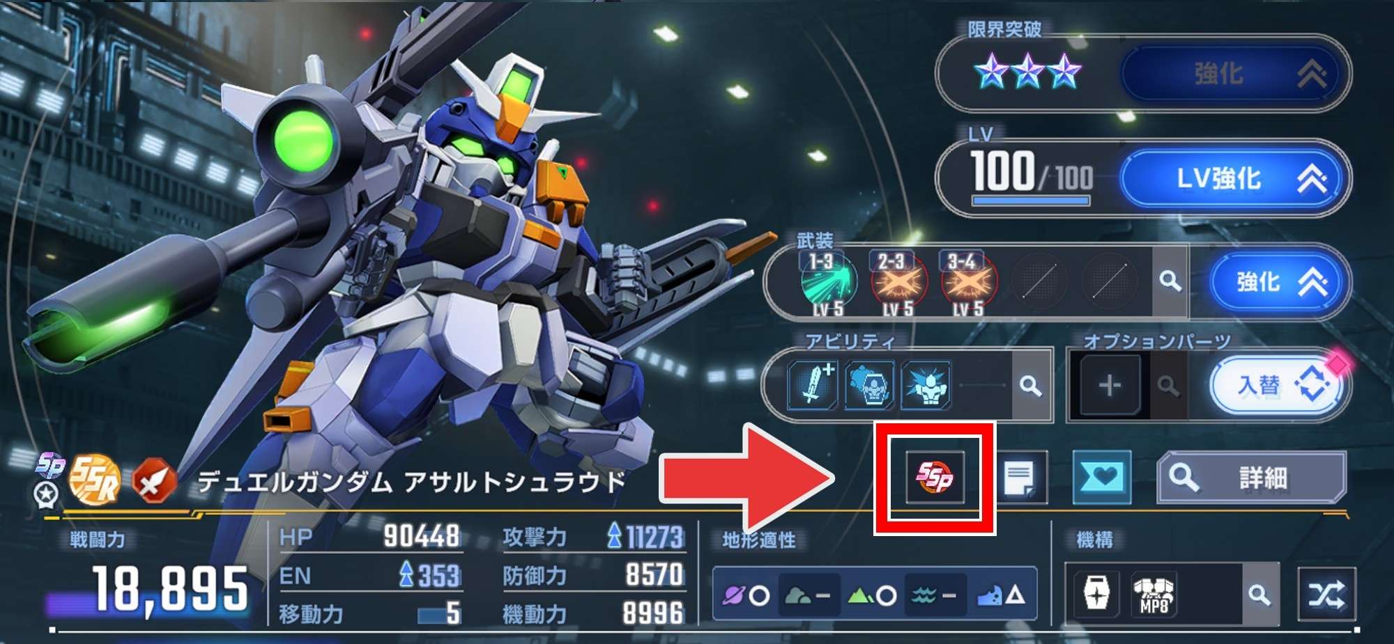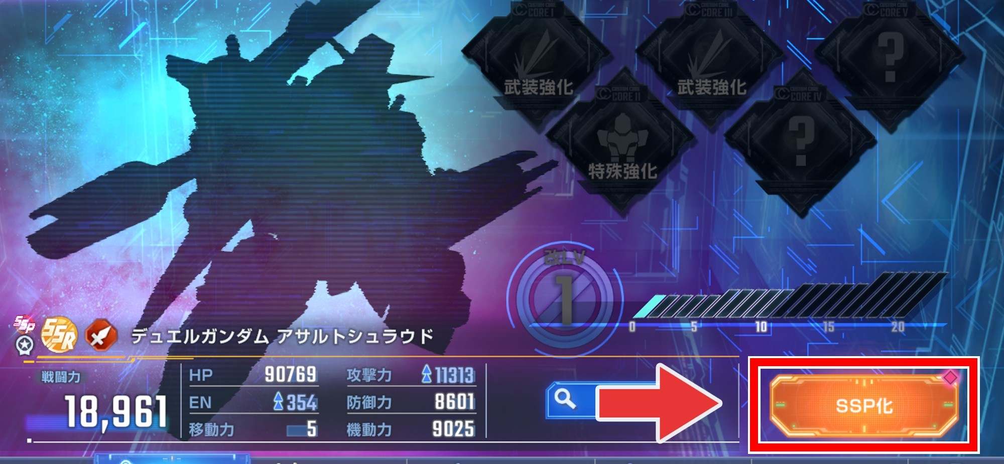 | ② | 拡大するユニット強化画面から「SSP」タップ |