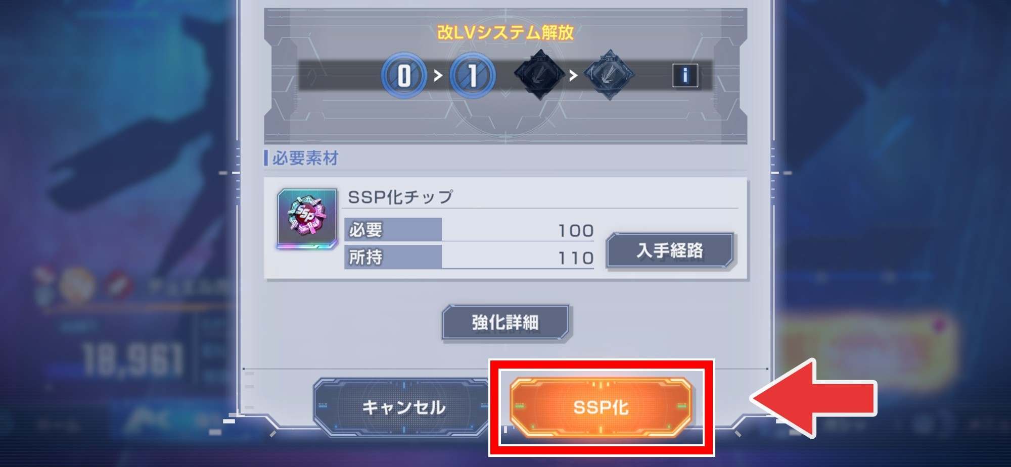 SSP化とは、SP化したユニットをさらに強化する機能です。ユニットのレベルと限界突破段階を最大にした状態で「SSP化チップ」を消費すると、SSP化が完了しユニットを強化できます。