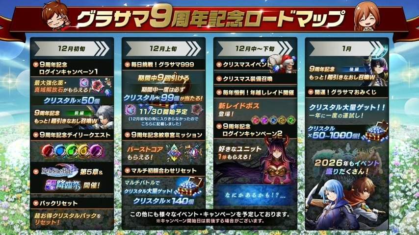 グラサマ(グランドサマナーズ)の9周年記念キャンペーンをご紹介。周年ユニットや引きなおしガチャ、ログインボーナス、年末年始のイベントなどの情報をまとめて記載しています。