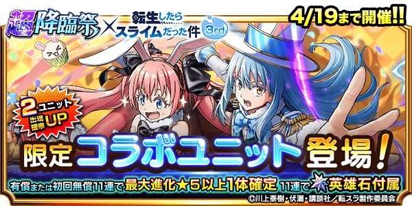 転スラコラボ夢幻英雄祭3rdガチャシミュレーター 【おすすめ度】★★★☆☆ 【開催日時】4/1(水)~4/19(日) |