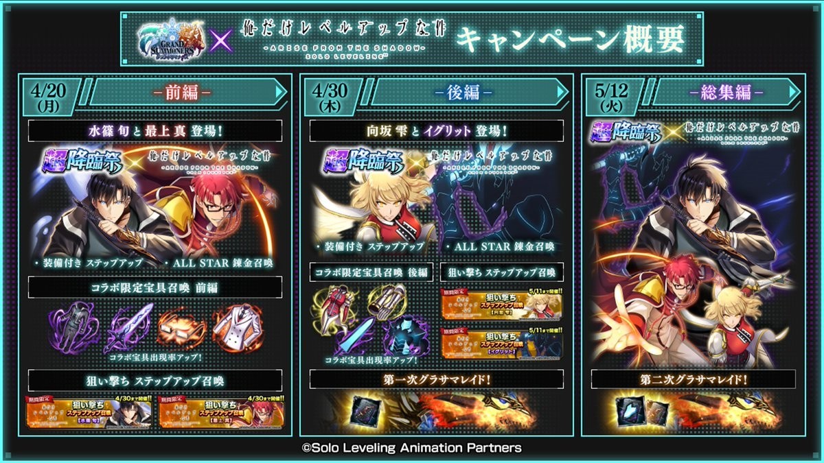 グラサマ(グランドサマナーズ)の俺レベコラボ(俺だけレベルアップな件)の情報をご紹介。コラボイベント、コラボ限定キャラ、コラボ限定装備の情報に加えて、ガチャやキャンペーンの詳細を掲載しています。