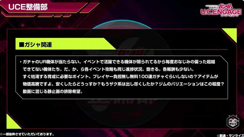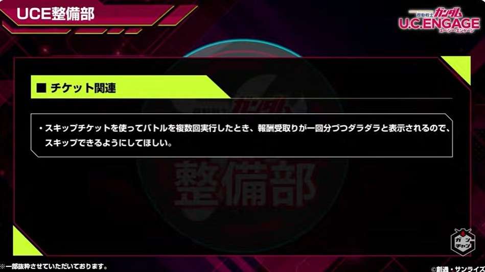UCE整備部が実施されました。今回の意見では、スキップチケットやキャラに関する声などについての回答が行われました。