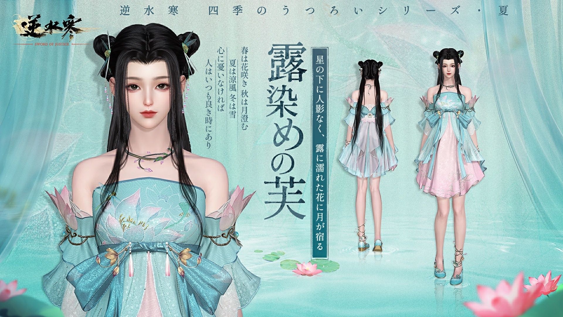 4月9日(木)より、新衣装の「露染めの芙」「露染めの荷」が実装されました。女性用衣装は蓮を思わせる配色の衣装、男性用衣装は上品な色合いで、落ち着いた佇まいの衣装です。