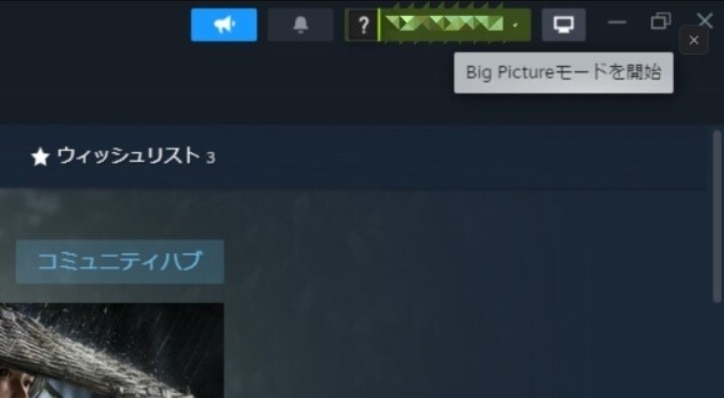 | 1 | 拡大するSteam右上のモニターアイコンを選択※Big Pictureモードを開始 |