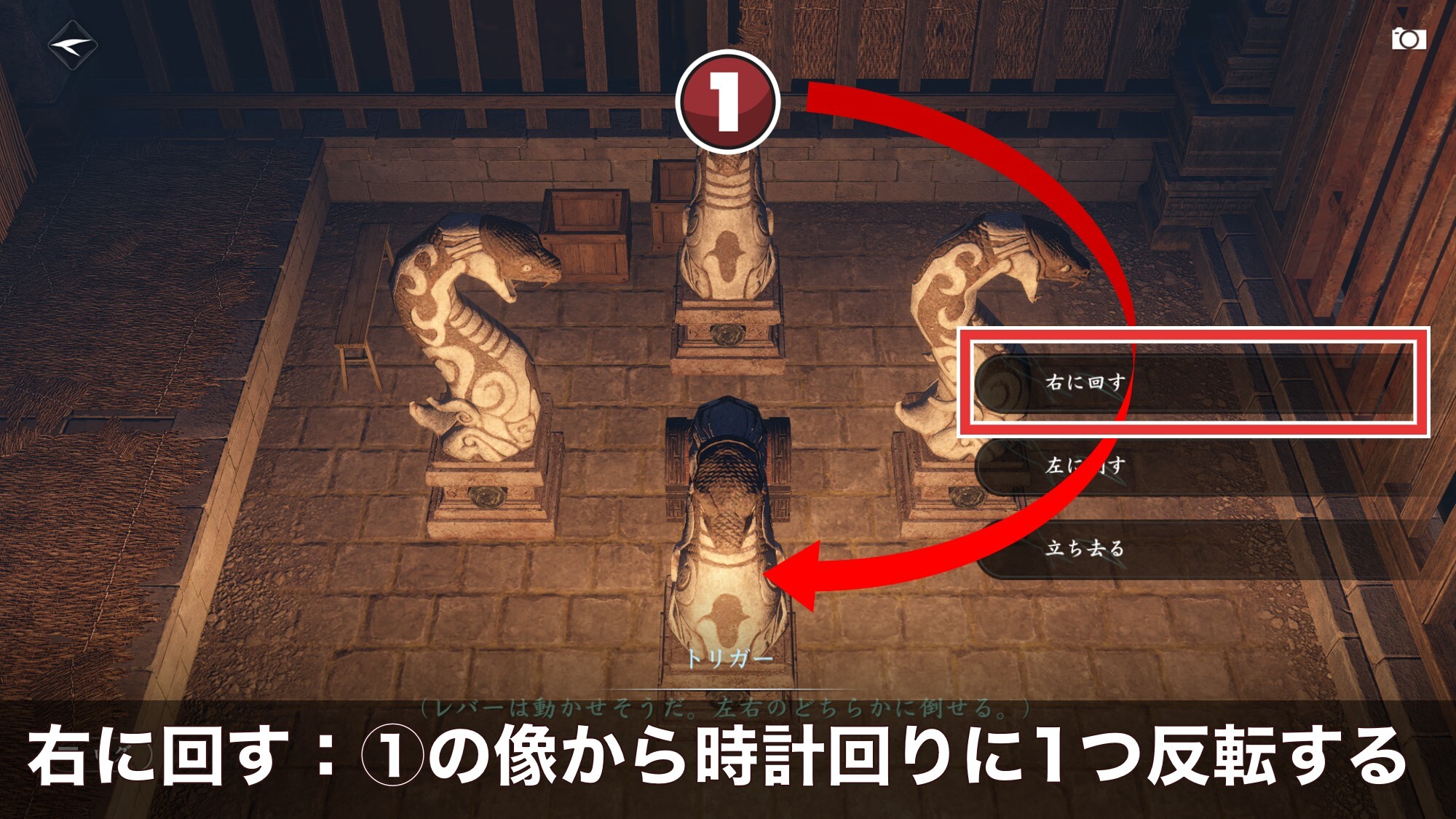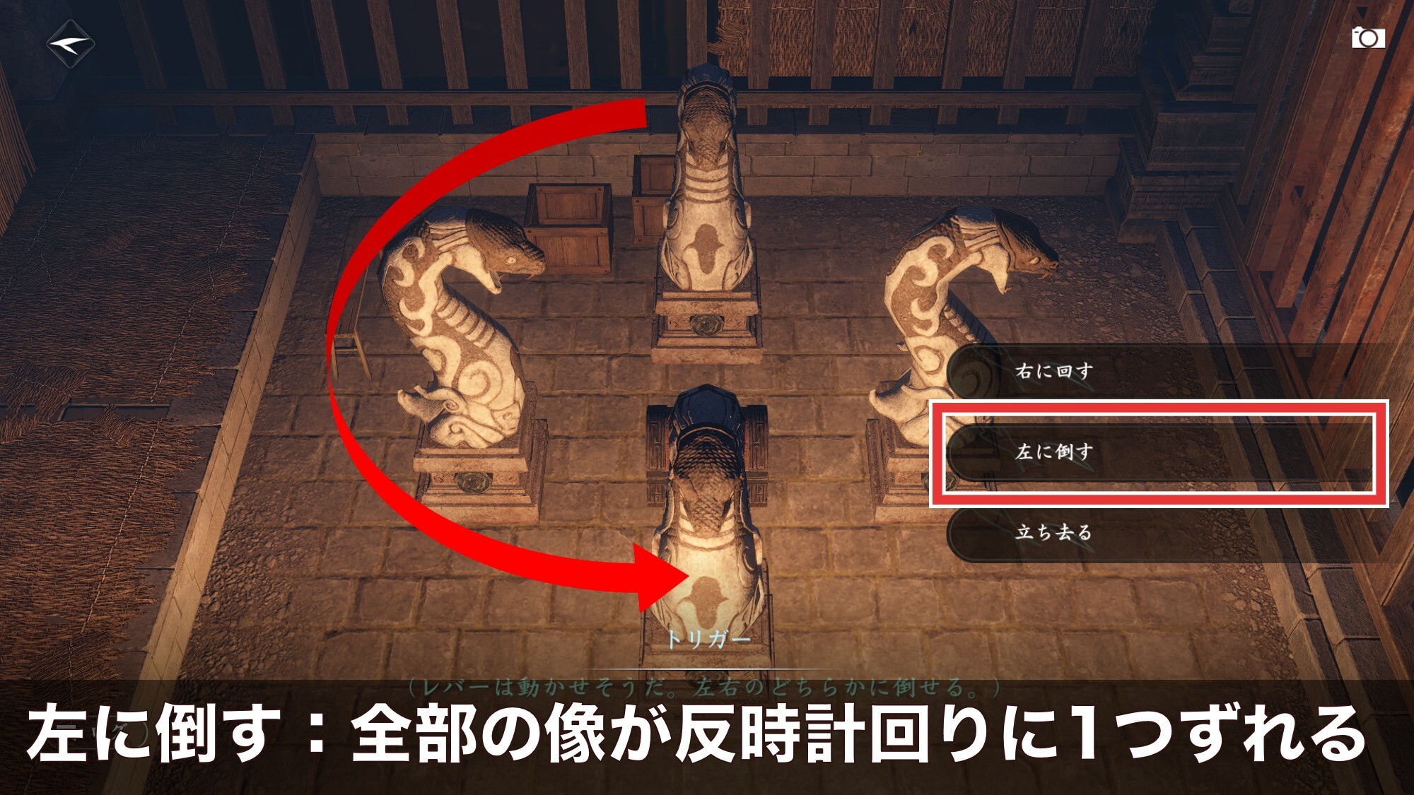 隠し通路では、像の謎解きをする必要があります。法則に従って「右に回す」と「左に倒す」で調整して、4つの像の向きを全て内側の宝箱に向けましょう。