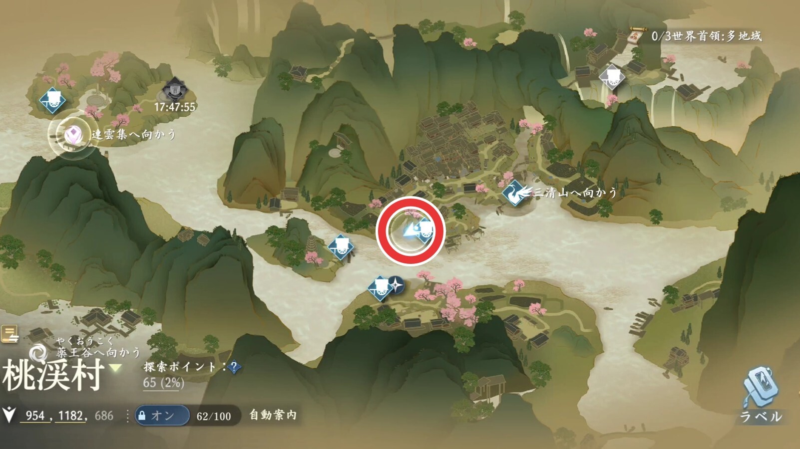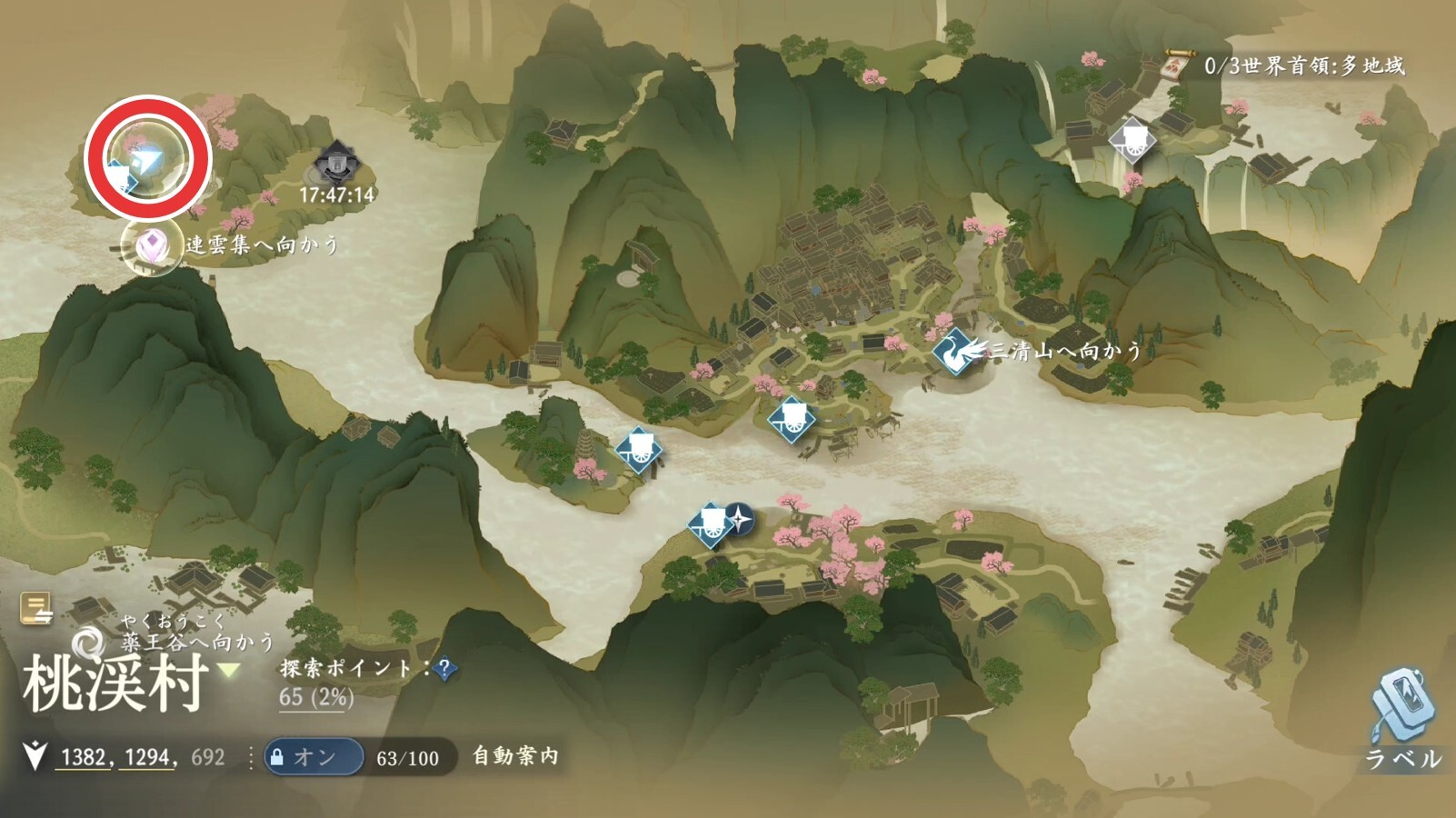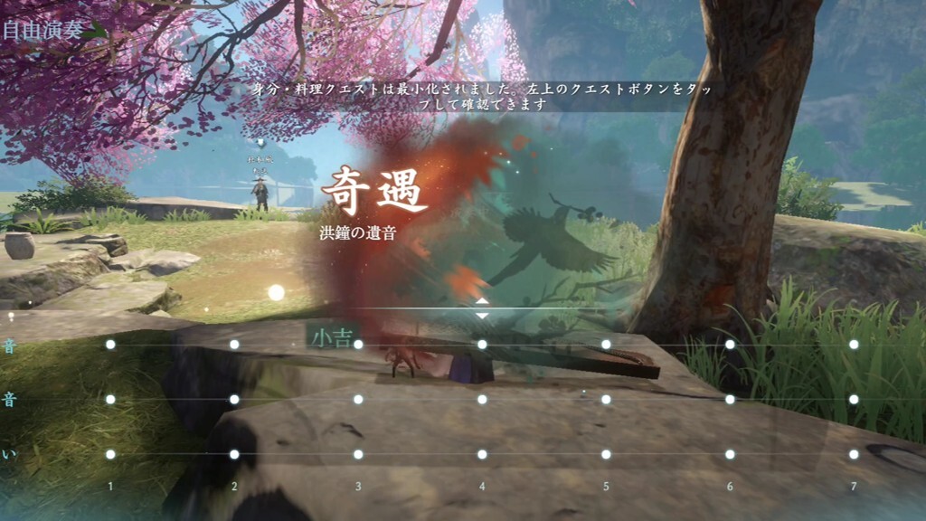 洪鐘の遺音の奇遇任務の発生場所は、桃渓村の座標(1382,1294)です。座標の場所で琴を弾くと奇遇が発生します。発生しない場合は、前提条件が満たされていないので、確認してみましょう。