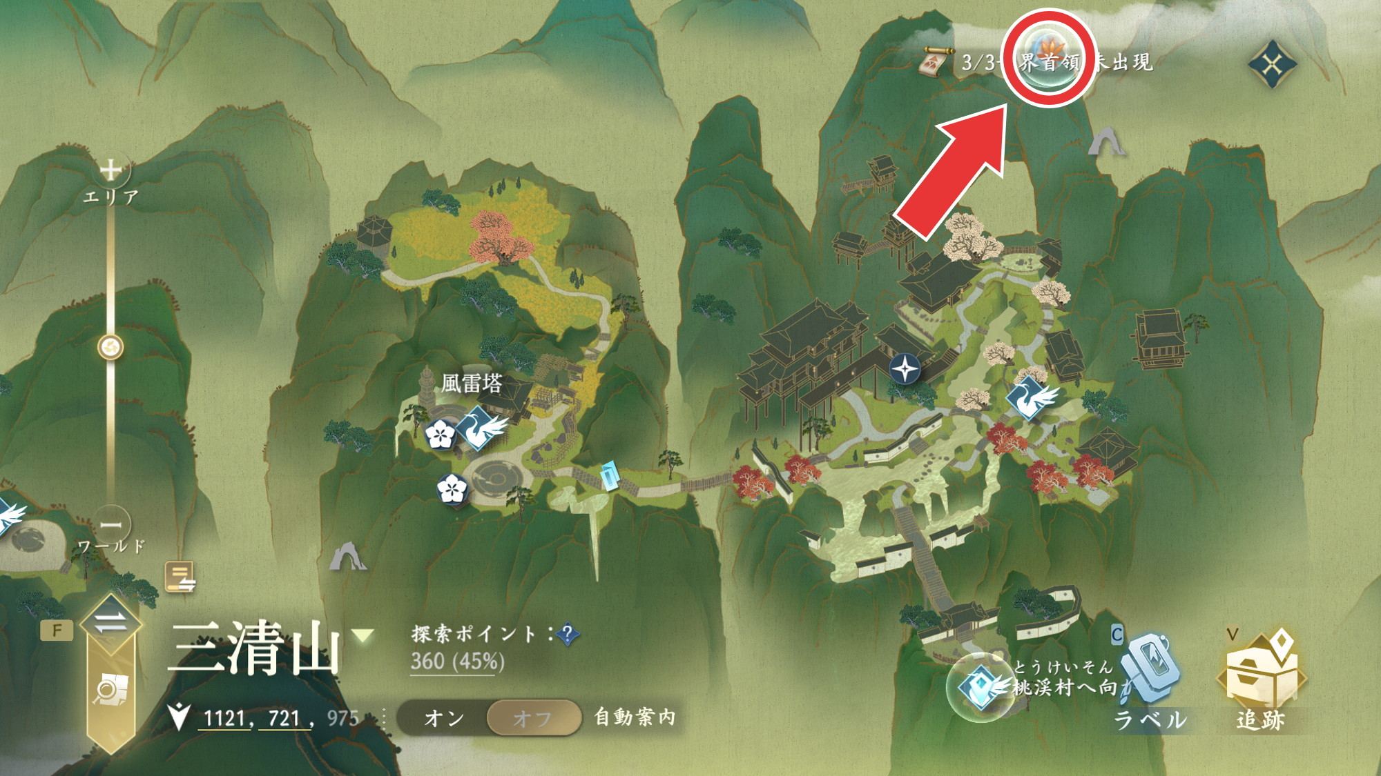 誰が錦の手紙を送るのかと同じ場所で発生する江湖任務「鶴が雲を運ぶ」では、絶技「怒髪衝天」を習得できます。ガイドに従って近くの山頂4か所で謎を解いてクリアしましょう。