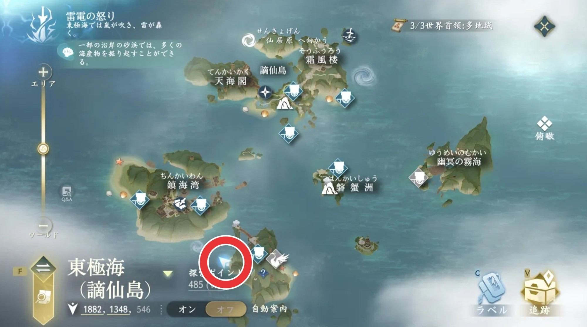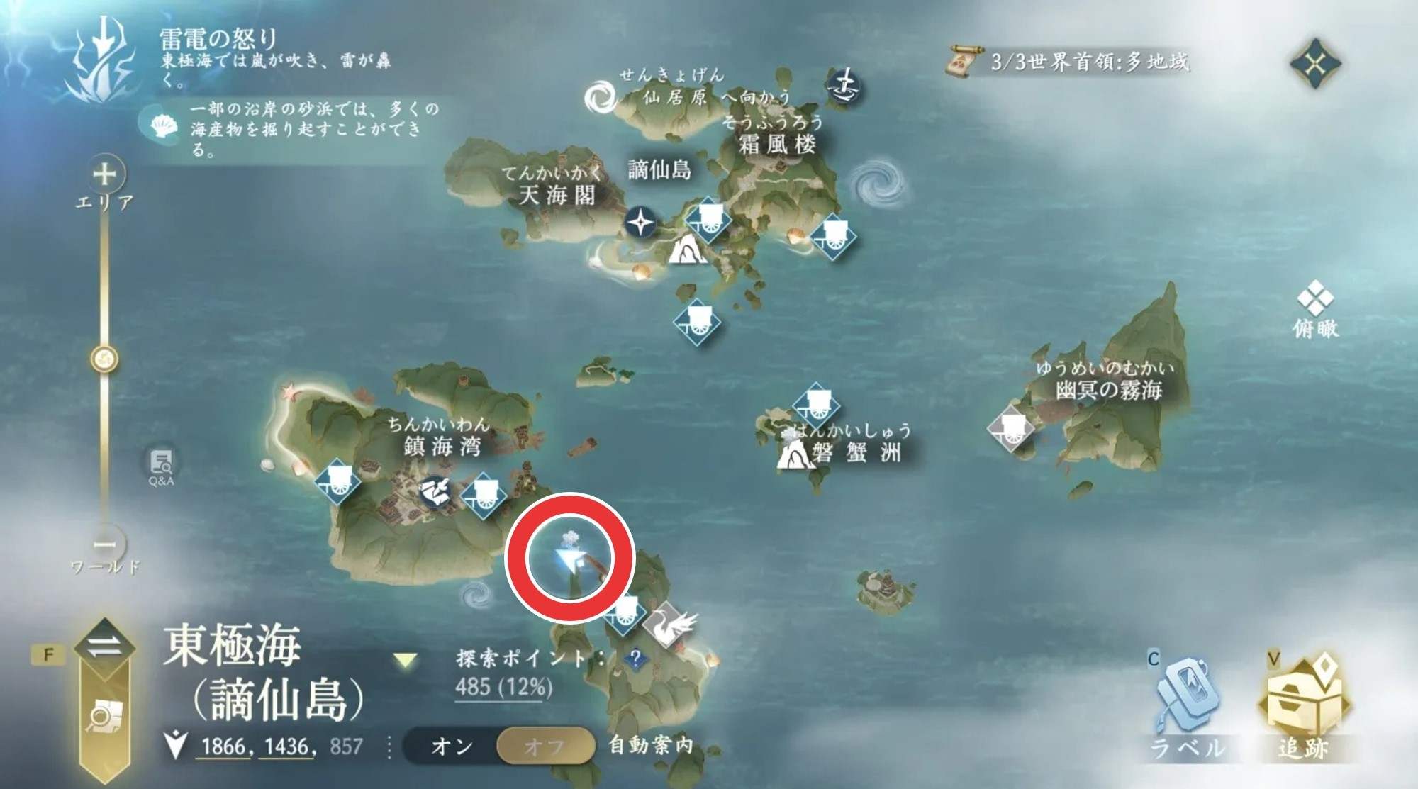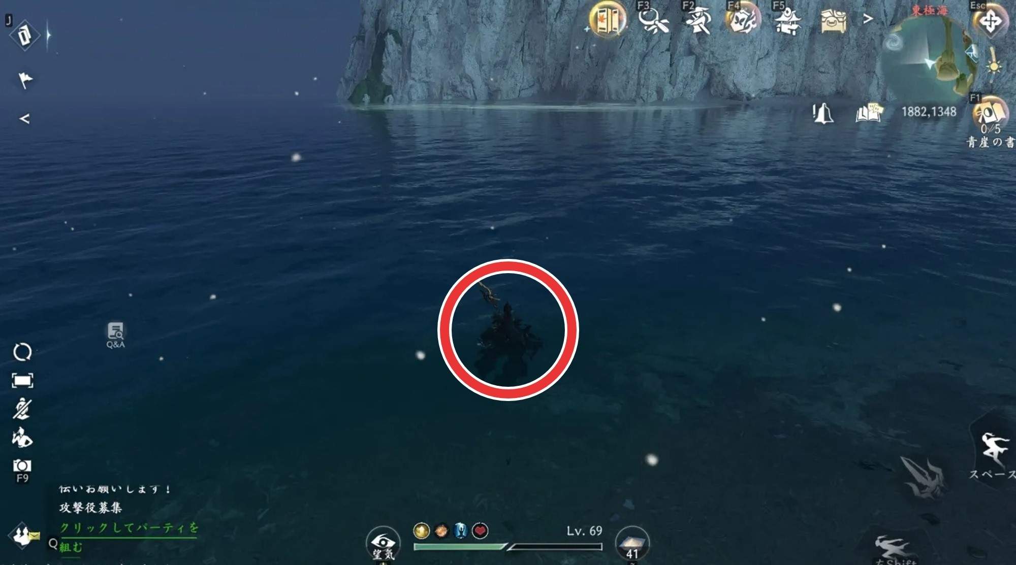 武狂の願いの奇遇任務の発生場所は、東極海の座標(1866,1436)です。近くの高所(1882,1348)から座標(1866,1436)に飛び込むと画面が切り替わり奇遇が発生します。