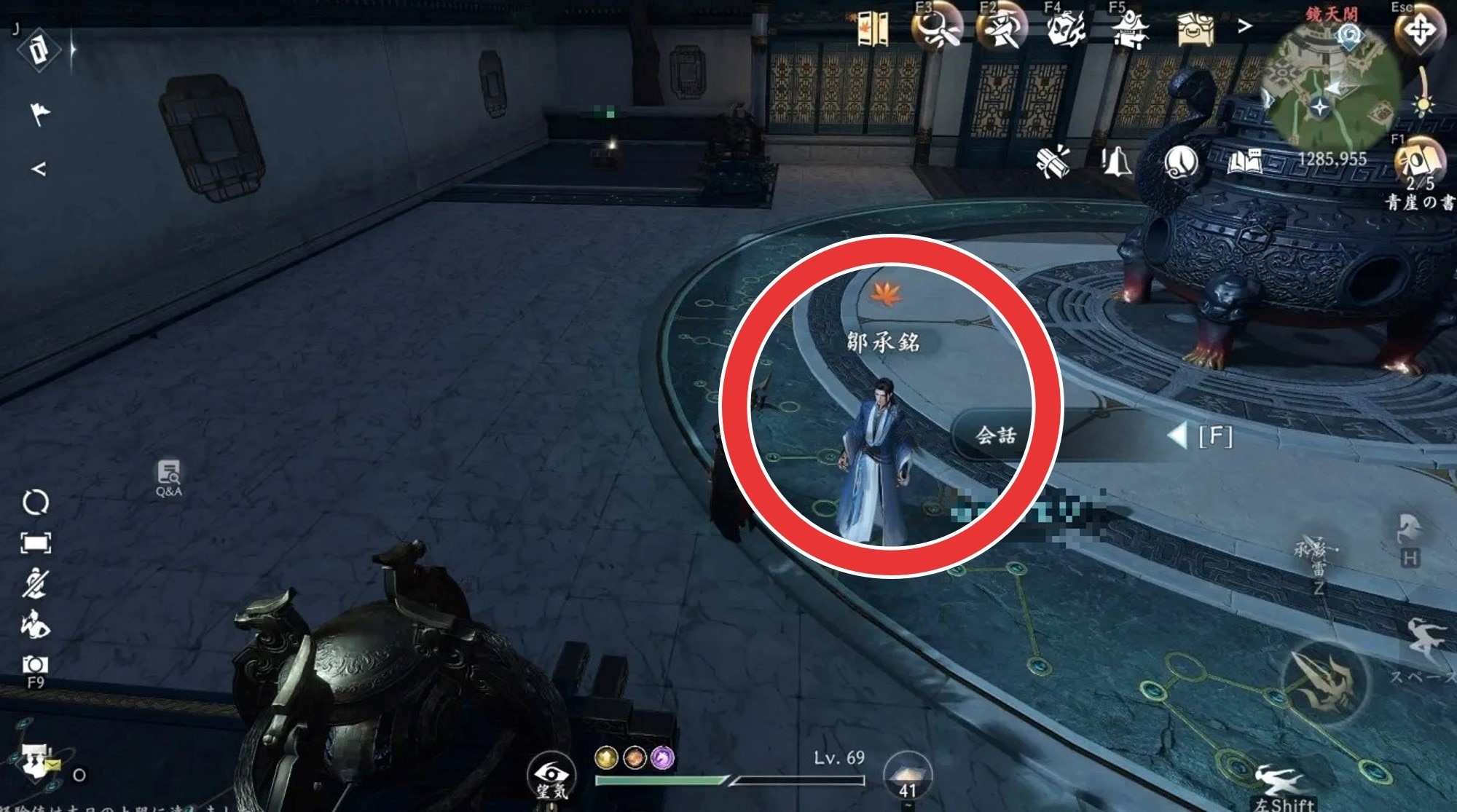 占星術で道を探るの奇遇任務の発生場所は、鏡天閣の座標(1285,955)です。鄒承銘に近づくと発生します。発生しない場合は近くを行き来したり時間を置いてみましょう。