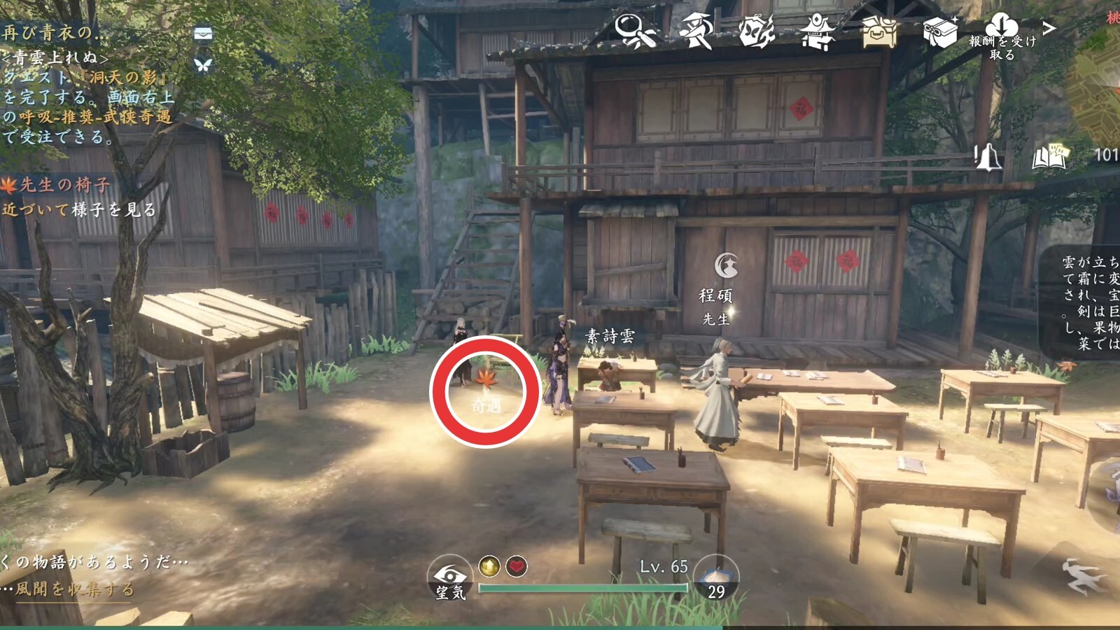 先生の椅子の奇遇任務の発生場所は、桃渓村の座標(1013.1029)です。建物前にある椅子に座ることで奇遇が発生します。