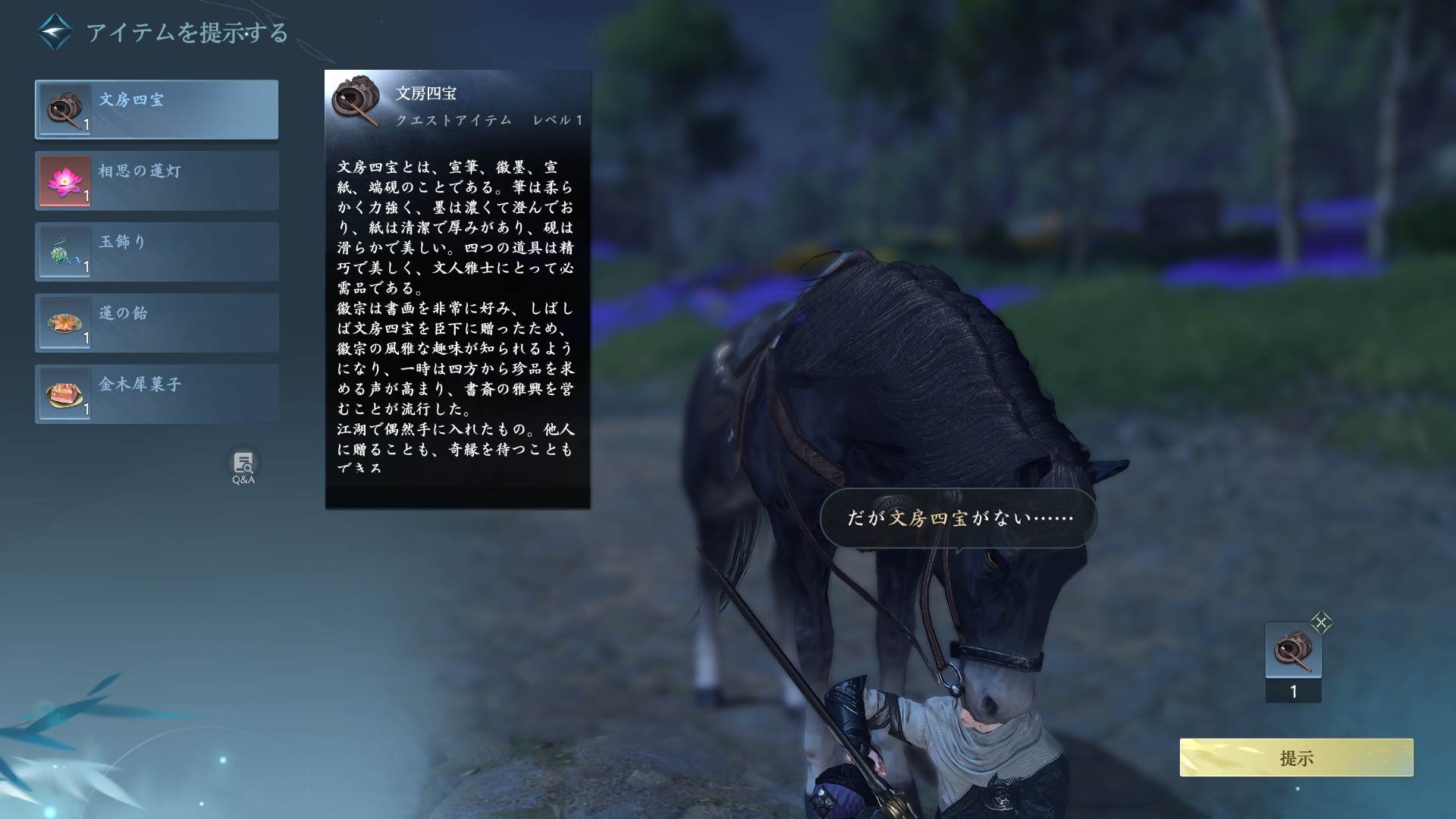 | 3 | 拡大する江湖の侠客に文房四宝を提示してクリア |