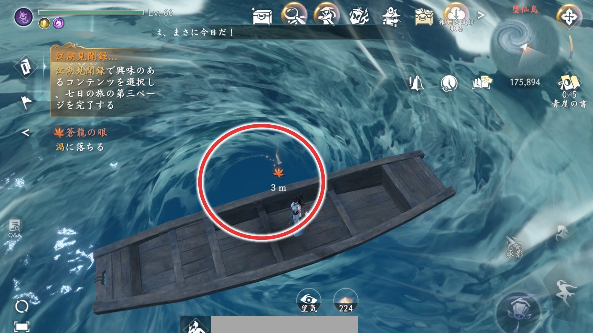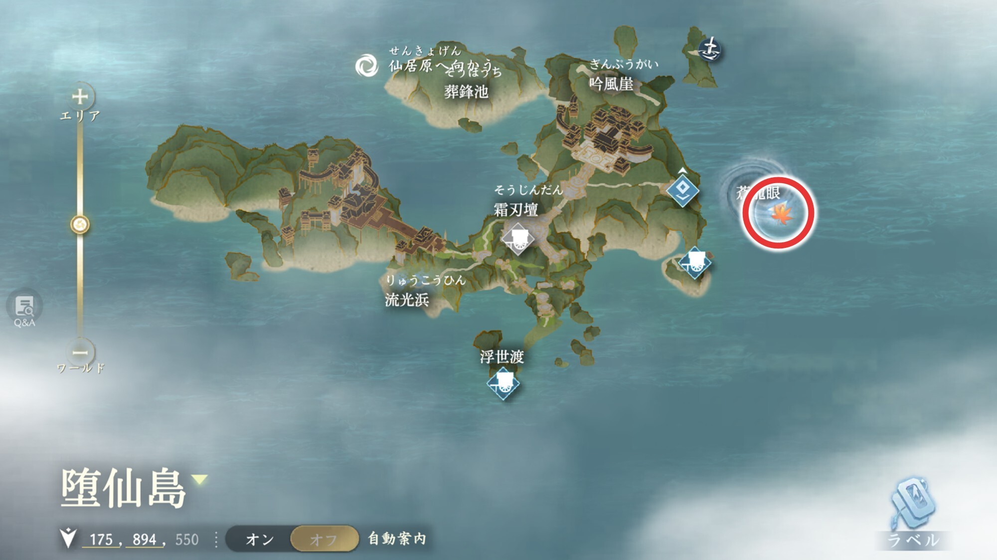 蒼龍の眼の奇遇任務の発生場所は、堕仙島の座標(175,894)です。蒼龍眼の渦の中に飛び込むと奇遇が発生します。ただし、前提条件として、華章クエスト「永遠の二人」を完了してないといけません。