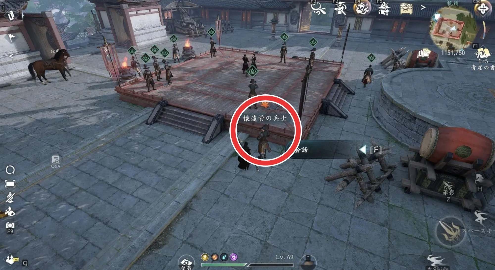 手合わせの奇遇任務の発生場所は、杭州の座標(1151,750)です。懐遠営の兵士に近づくと発生します。発生しない場合は、近くを行き来したり日を改めて訪れてみましょう。
