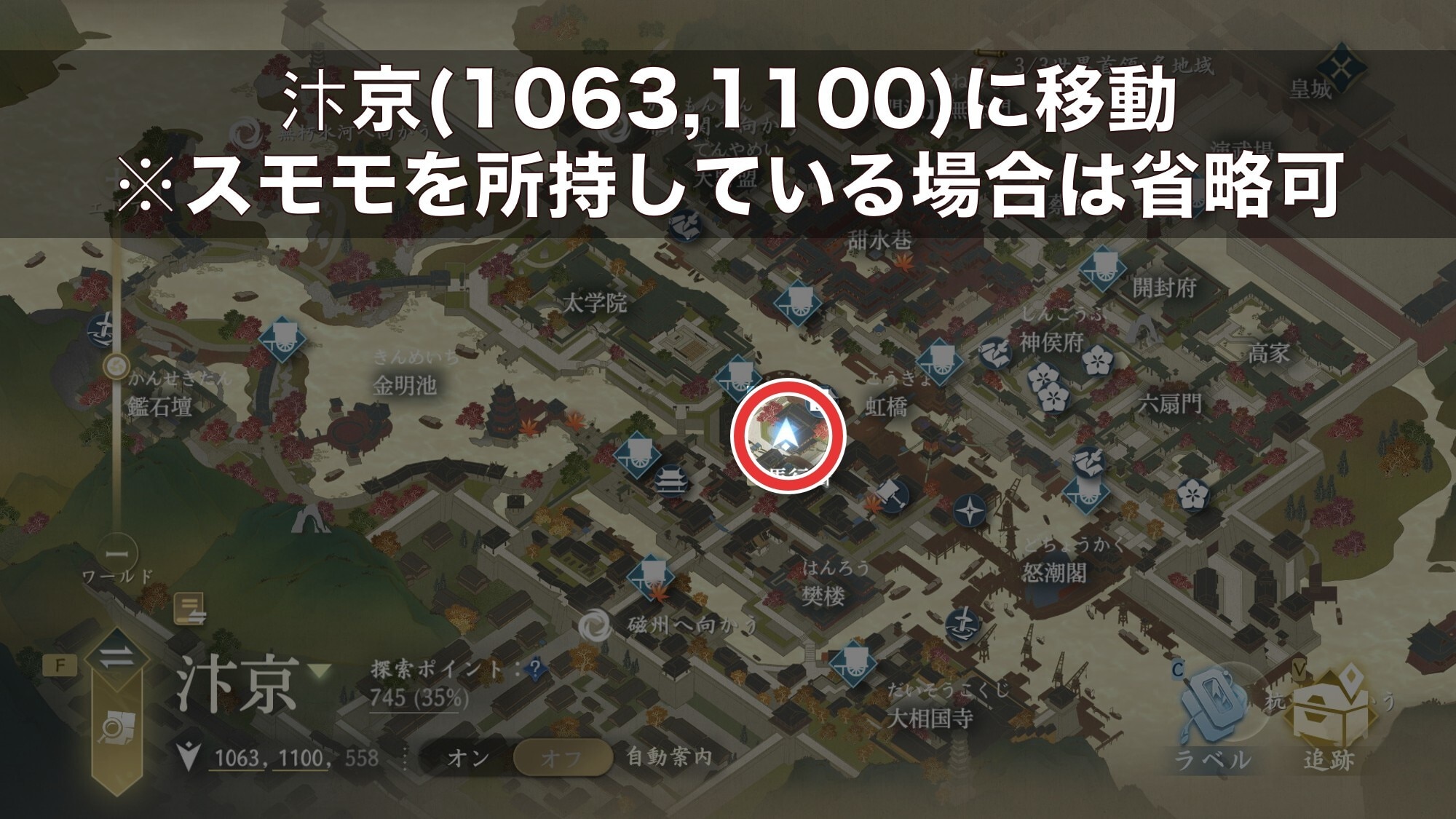 | 1 | 拡大する汴京(1063,1100)に移動※既にスモモを所持している場合は省略 |