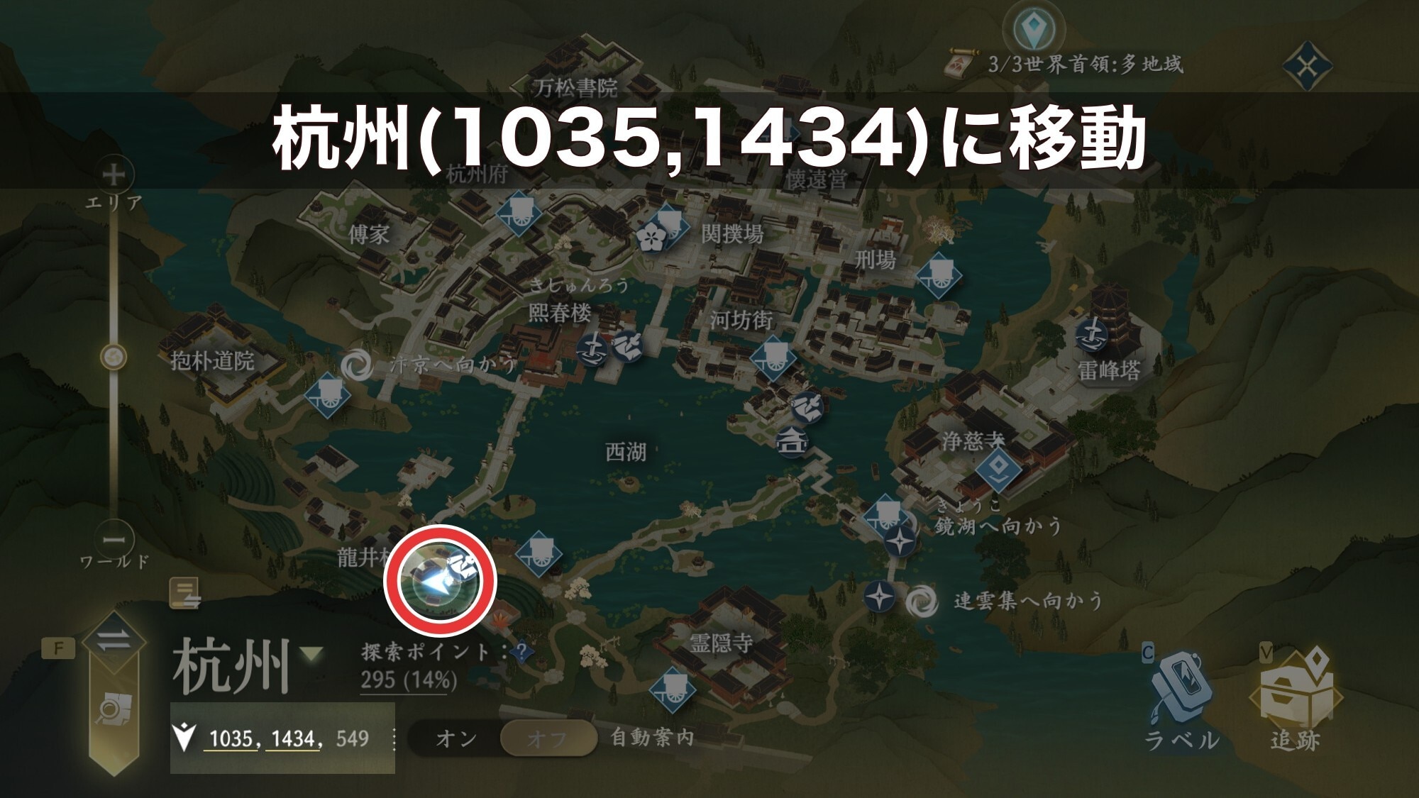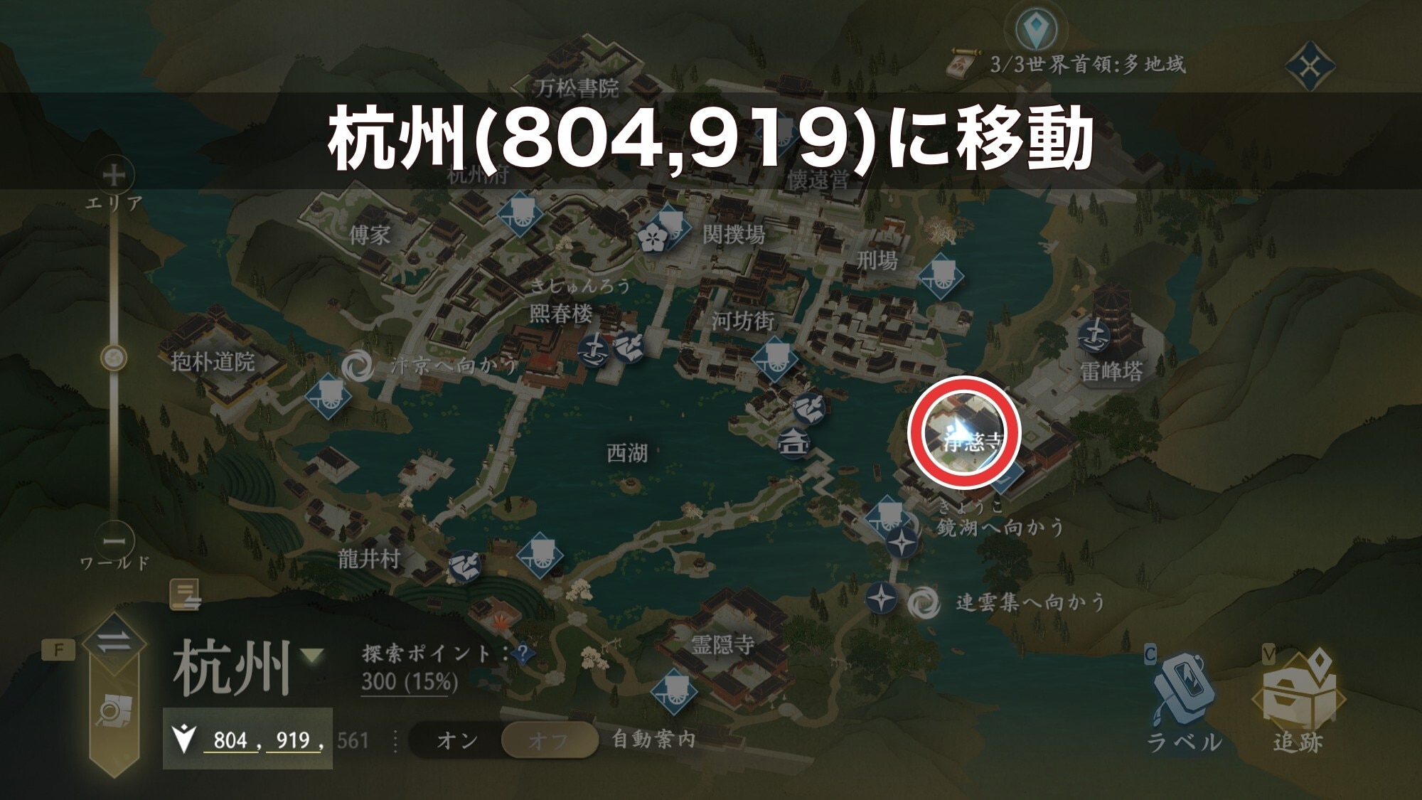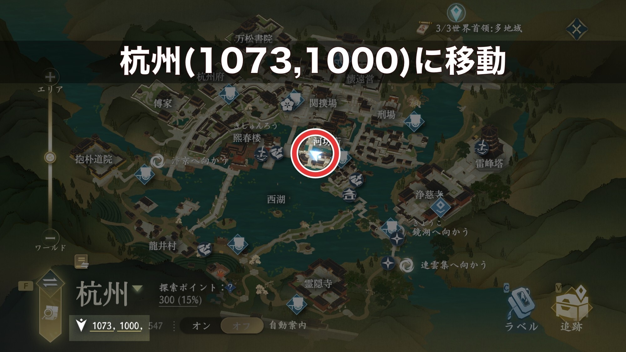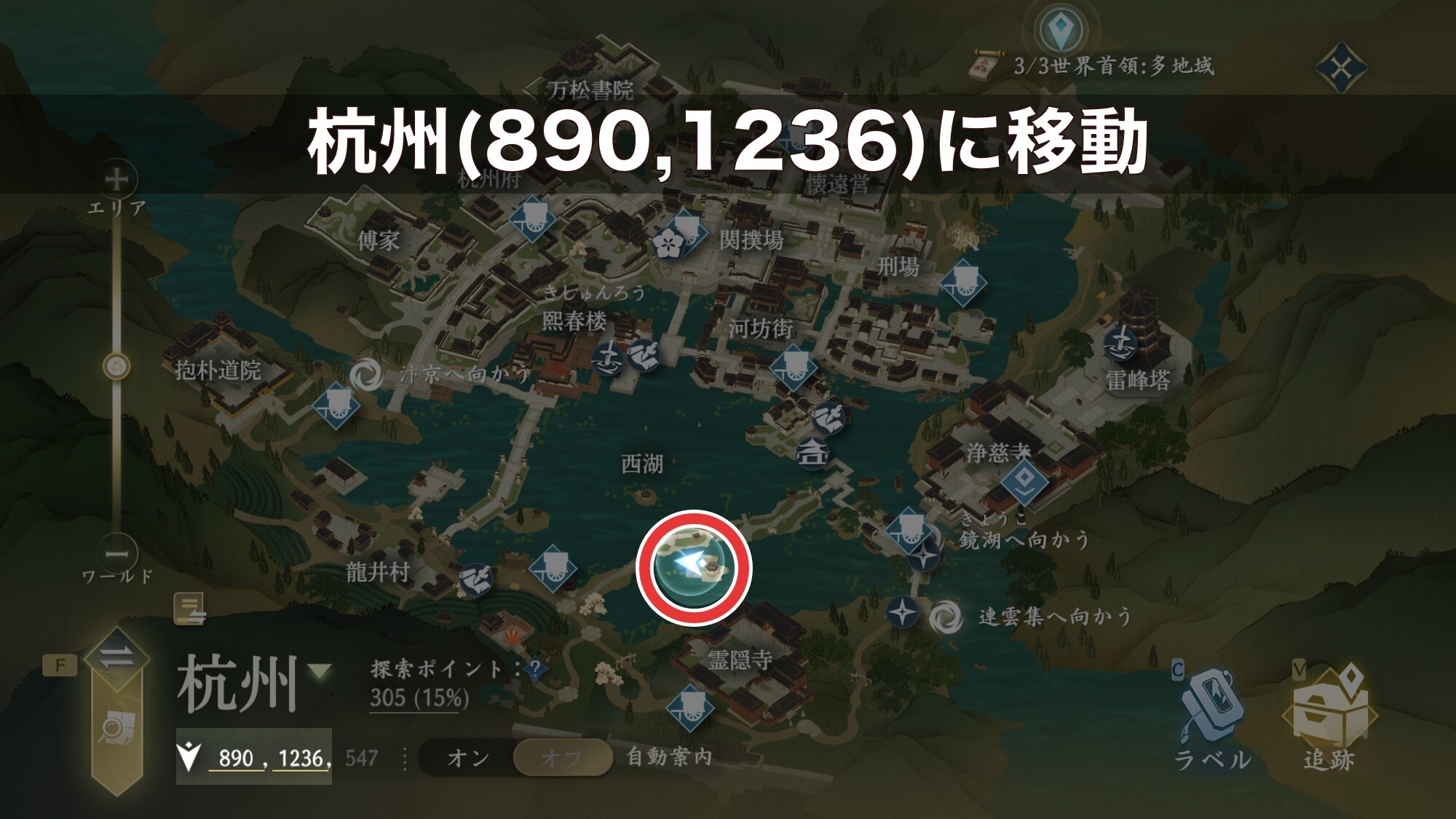 杭州食紀行・一の奇遇任務の発生場所は、杭州の座標(890,1236)です。林洪に探索アクション「一礼する」を行うと発生するため、奇遇が発生するまでアクションを使用しましょう。