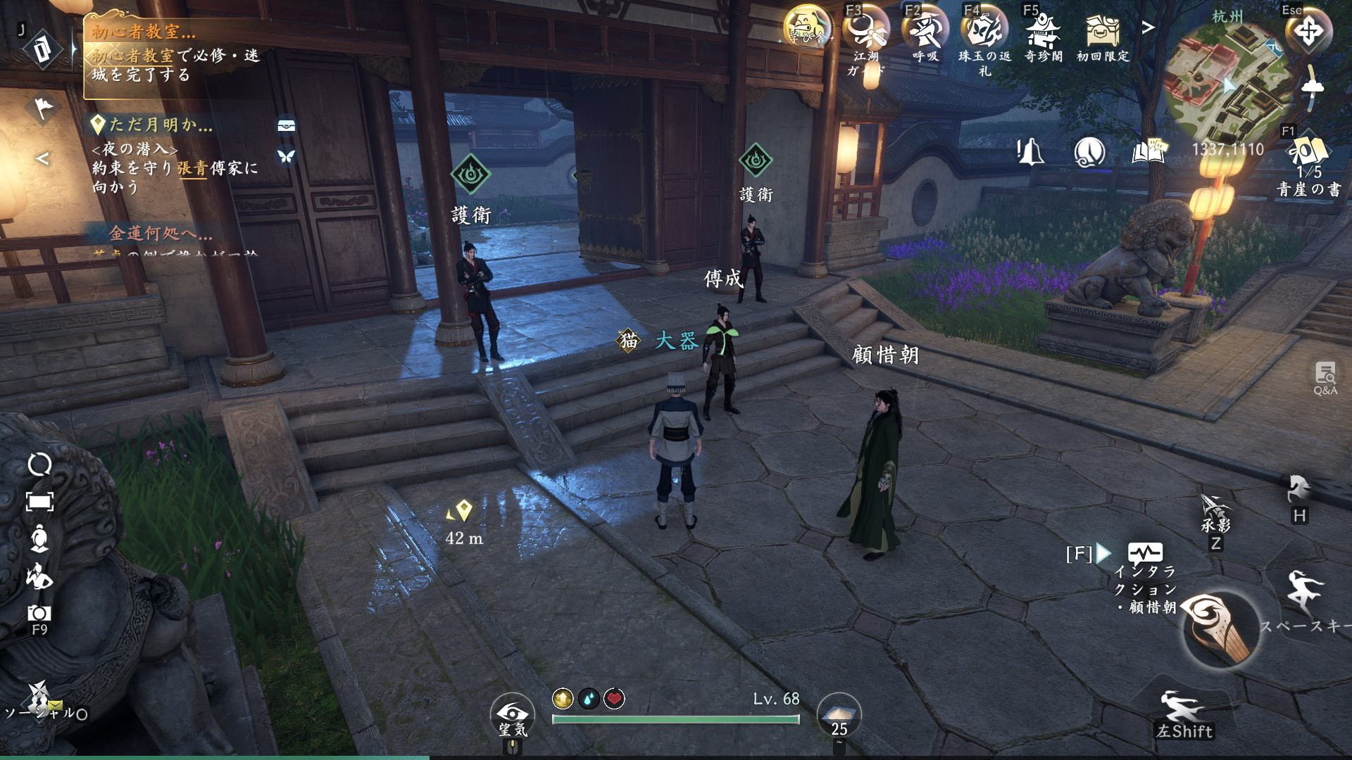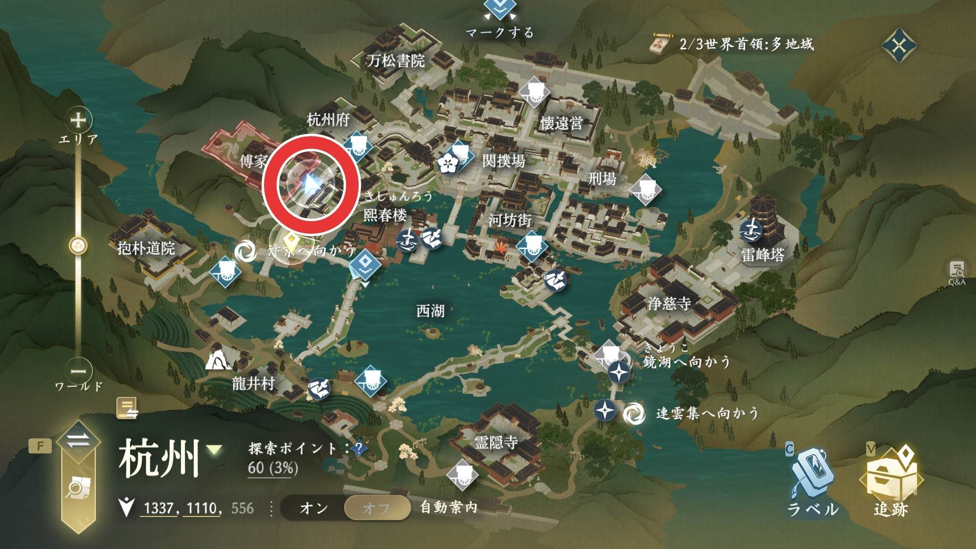 江湖懸賞度を上げる時は、杭州の傅家(1337,1110)がおすすめです。護衛に近づいて注意してもらうだけで江湖懸賞度を約10上げることができます。