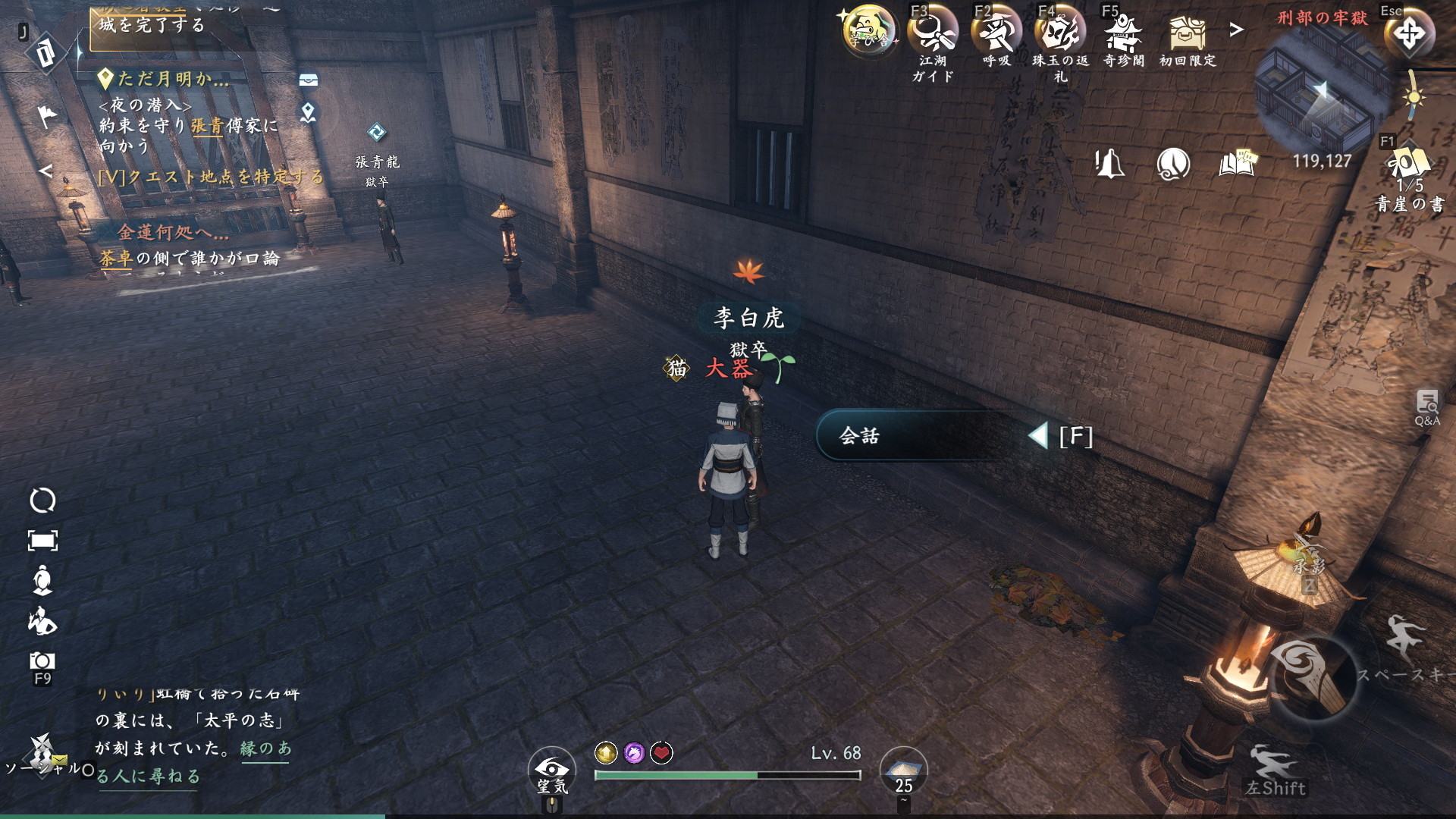 善悪両断の奇遇任務の発生場所は、刑部の牢獄(杭州)の座標(119,127)です。牢獄に入った後に李白虎に話しかけると発生します。牢獄ヘは捕まって入る必要があるため、悪さをして江湖懸賞度を上げましょう。