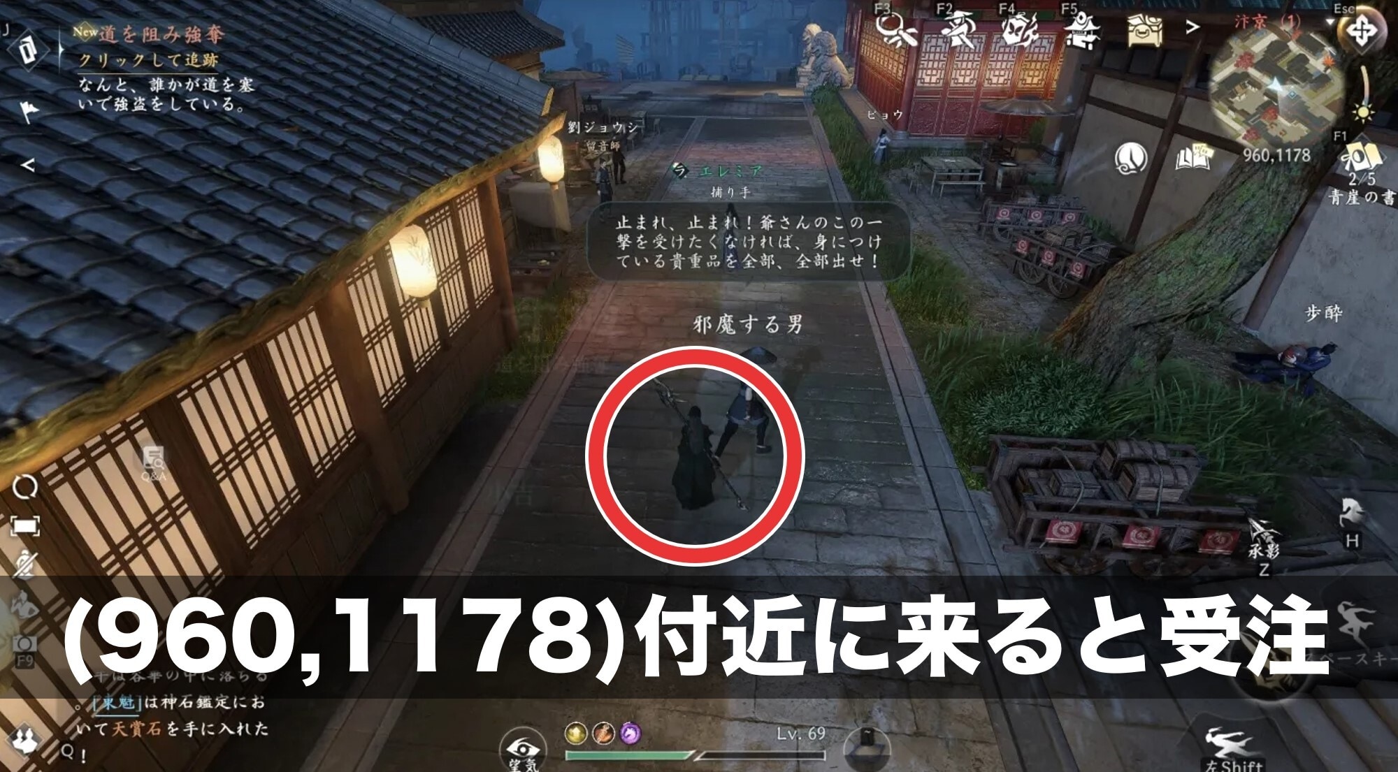 2か所で事前準備を済ませたあとは、道を阻み強奪の発生場所である座標(960,1178)へ向かいましょう。