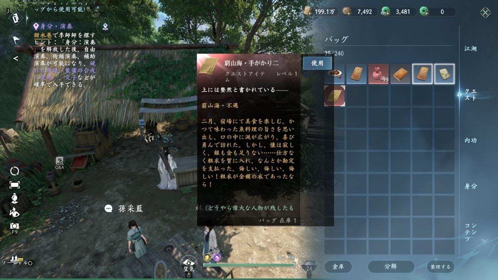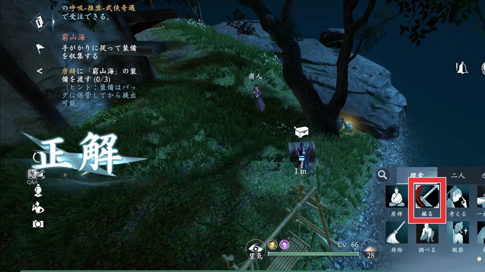 | 座標(618,789)の宝箱をスキルで壊して、 「手がかり四(惜春)」を入手 |