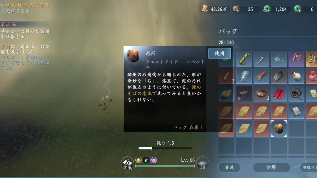 | 滝(423,729)の前でバッグ(クエスト)から、 奇石を使用して「手がかり八(山豚無知)」を入手 |