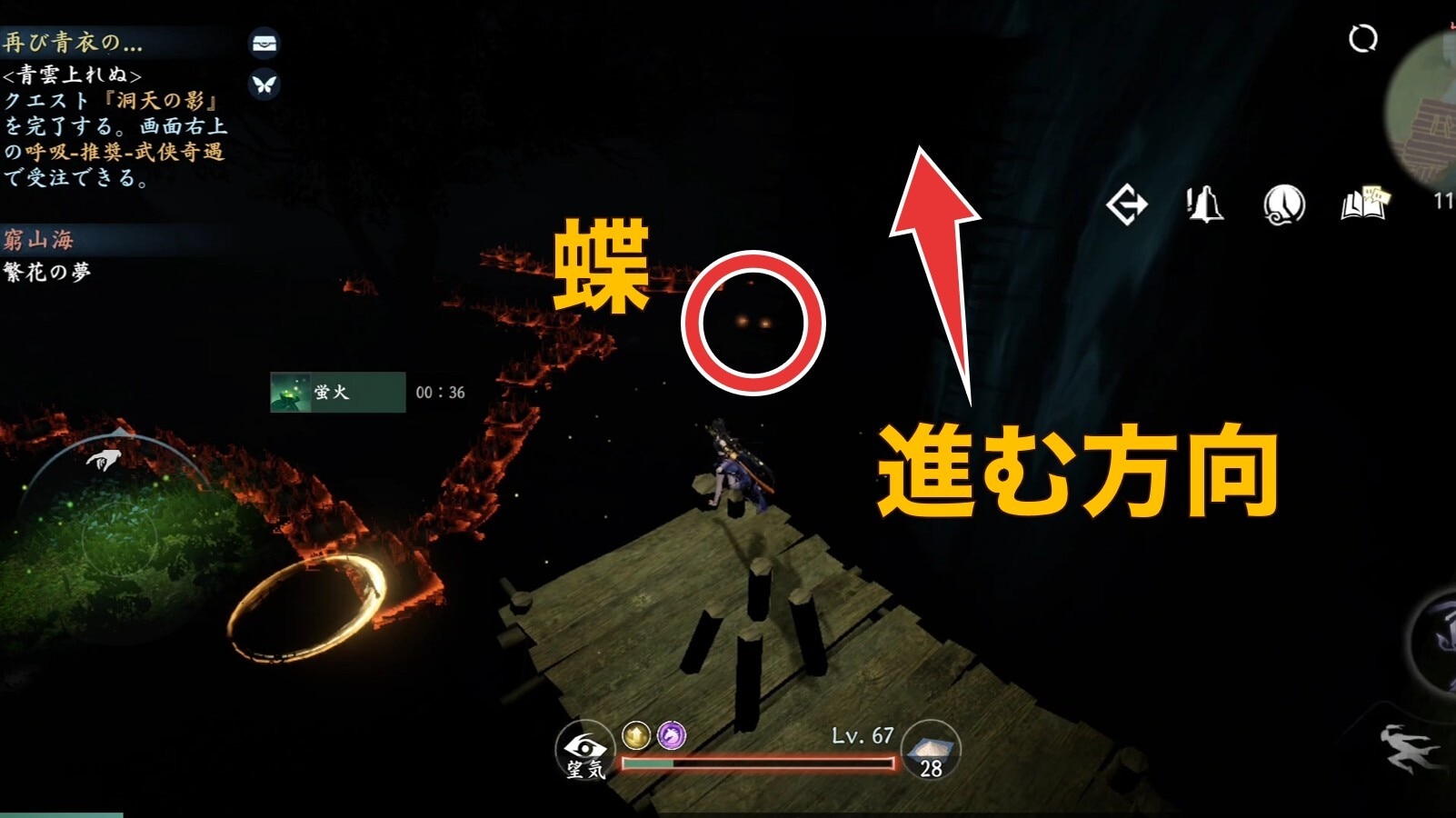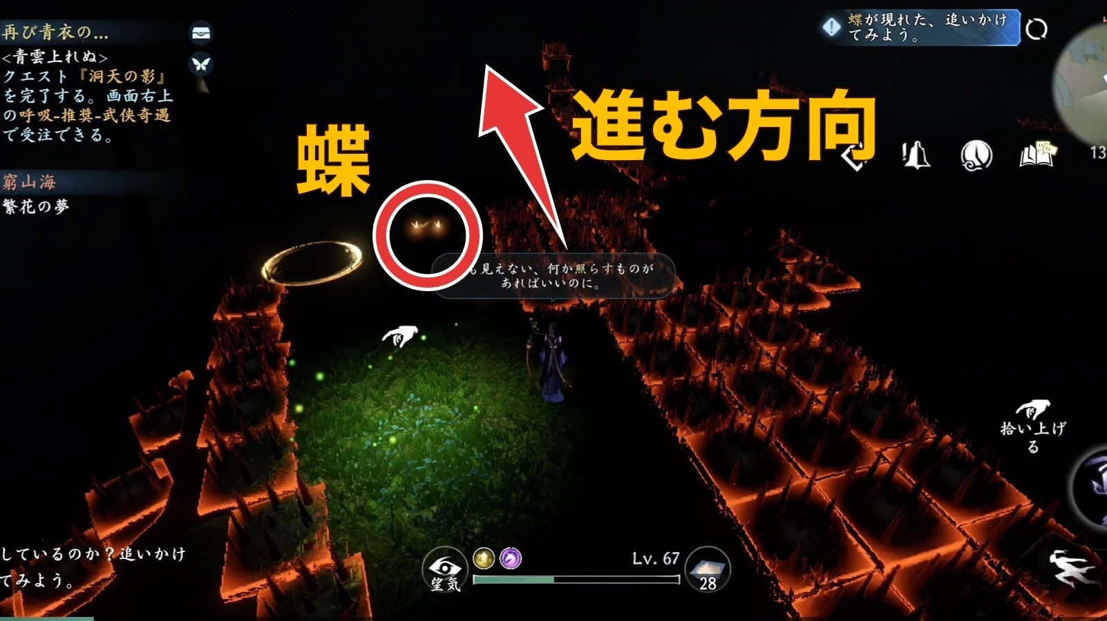 | 23 | 拡大する足元にある1つ目の紙を拾い、「蛍の光」を使用して二匹の蝶を追いかける |