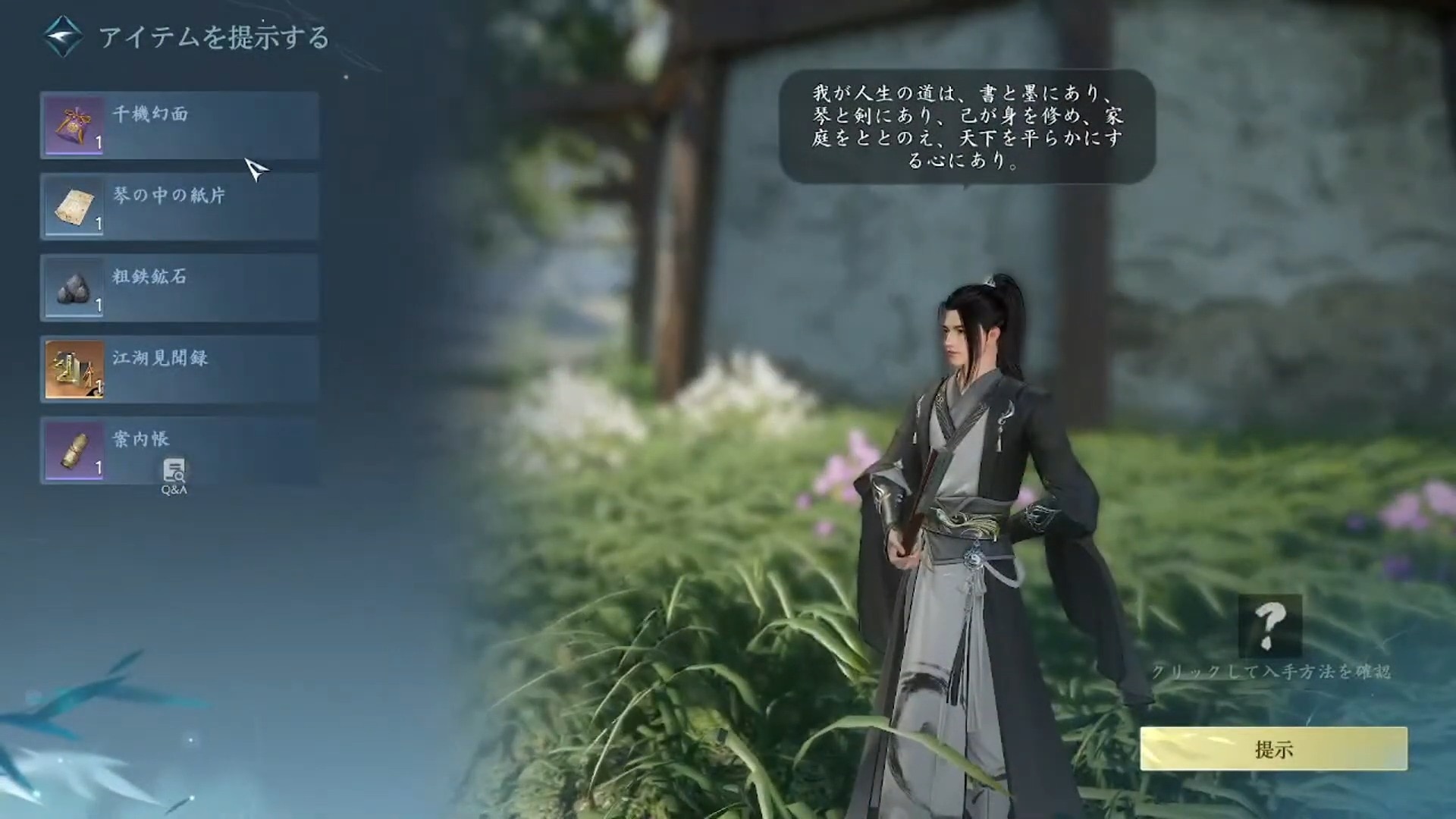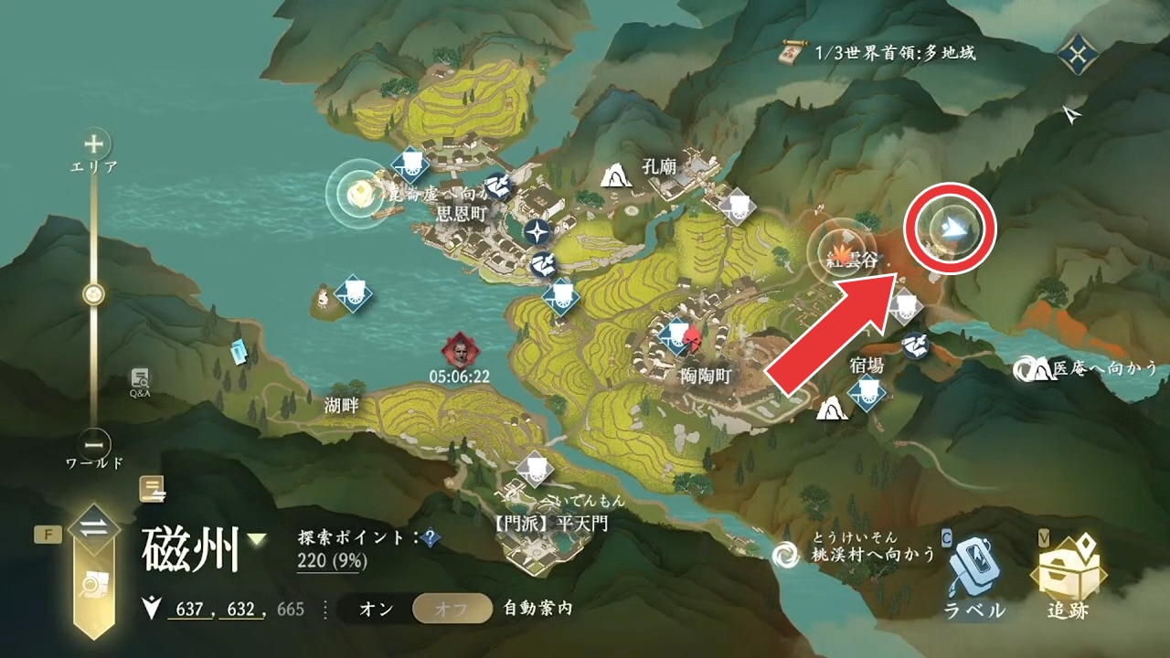 | 7 | 拡大する湖中の高塔(1283,1314)にいる周清秋に「琴の中の紙片」を渡すと完了※完了時、奇遇「平天の道」発生 |
