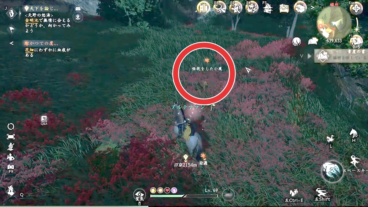 鹿の導きの奇遇任務の発生場所は、磁州の座標(637,632)です。怪我をした小鹿の周囲に行くと奇遇任務が発生し、小鹿に話し掛けること受注できます。