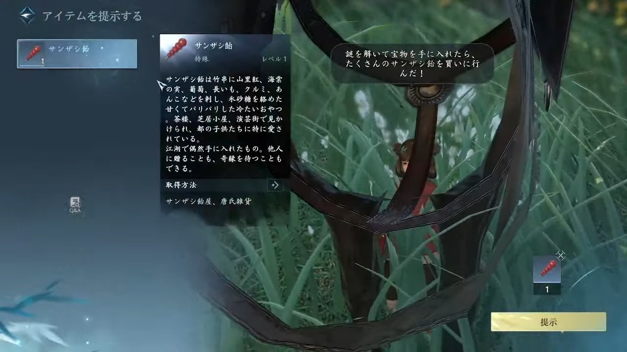 サンザシ飴は、磁州(1285,1060)にいる唐糖または、汴京(1180,973)にいる唐サンザシから交子10で購入できます。どちらも座標直下にいるわけではなく、周囲を徘徊しているので、その場にいない場合は周囲を探しましょう。