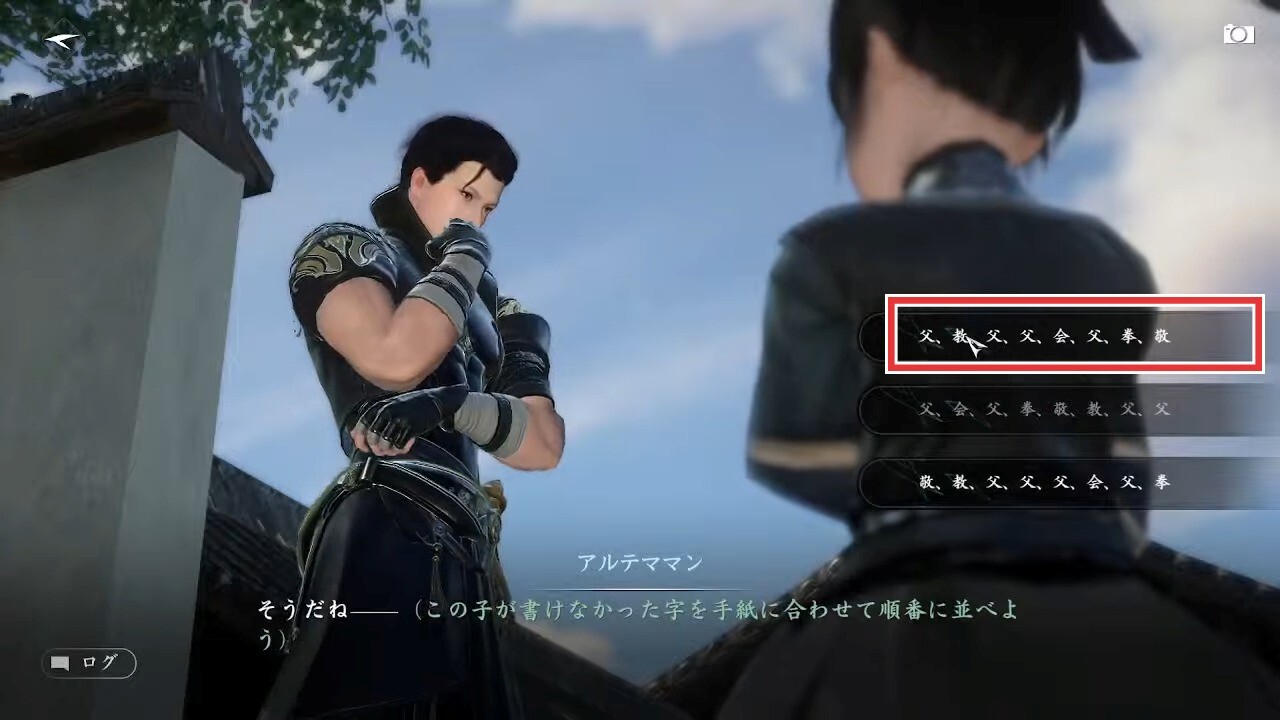 | 3 | 拡大する会話の三択で一番上の「父、教、父、父、会、父、拳、敬」を選ぶ |