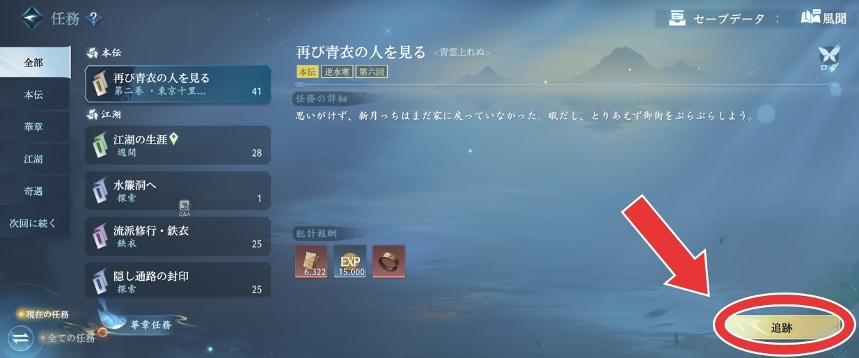 ガイドに任務が表示されていない場合は、メニュー→任務→追跡をクリックすることでガイドに表示できます。