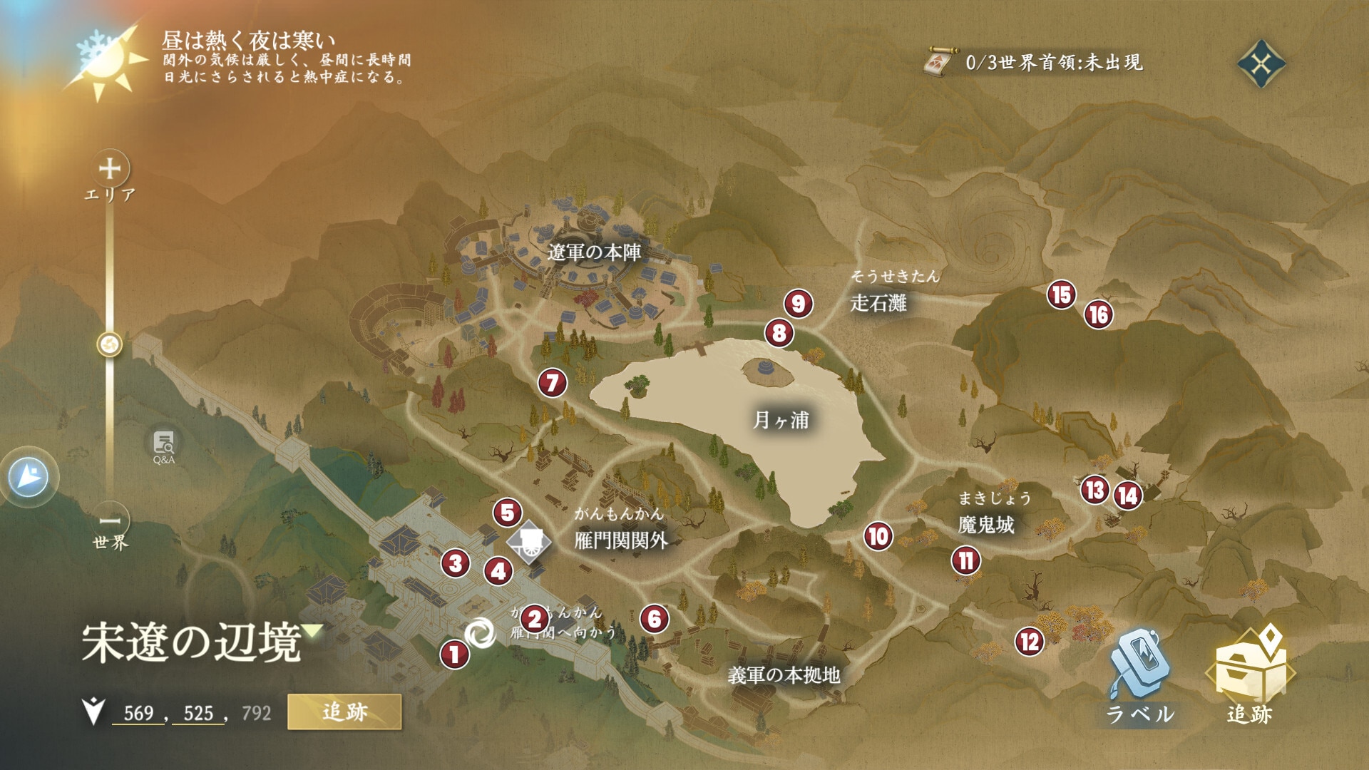 宋遼の辺境のギミックは、「気候」「竜巻」「砂嵐」の3つです。特に砂漠の気候ギミックは、気血(体力)が減少し続けるため、衣装を着替えて気候の影響を受けないようにしましょう。