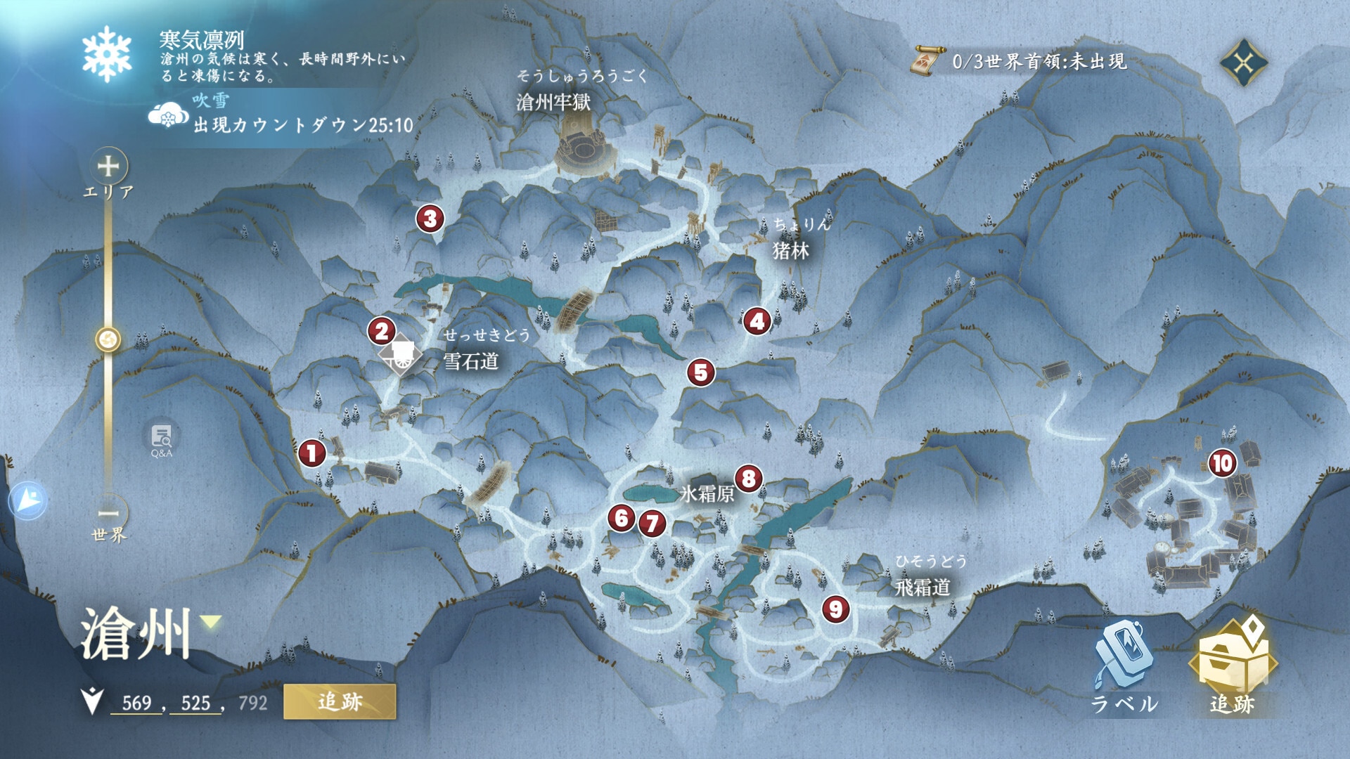 滄州のギミックは、「気候」「吹雪」の2つです。特に寒冷地の気候ギミックは、気血(体力)が減少し続けるため、衣装を着替えて気候の影響を受けないようにしましょう。