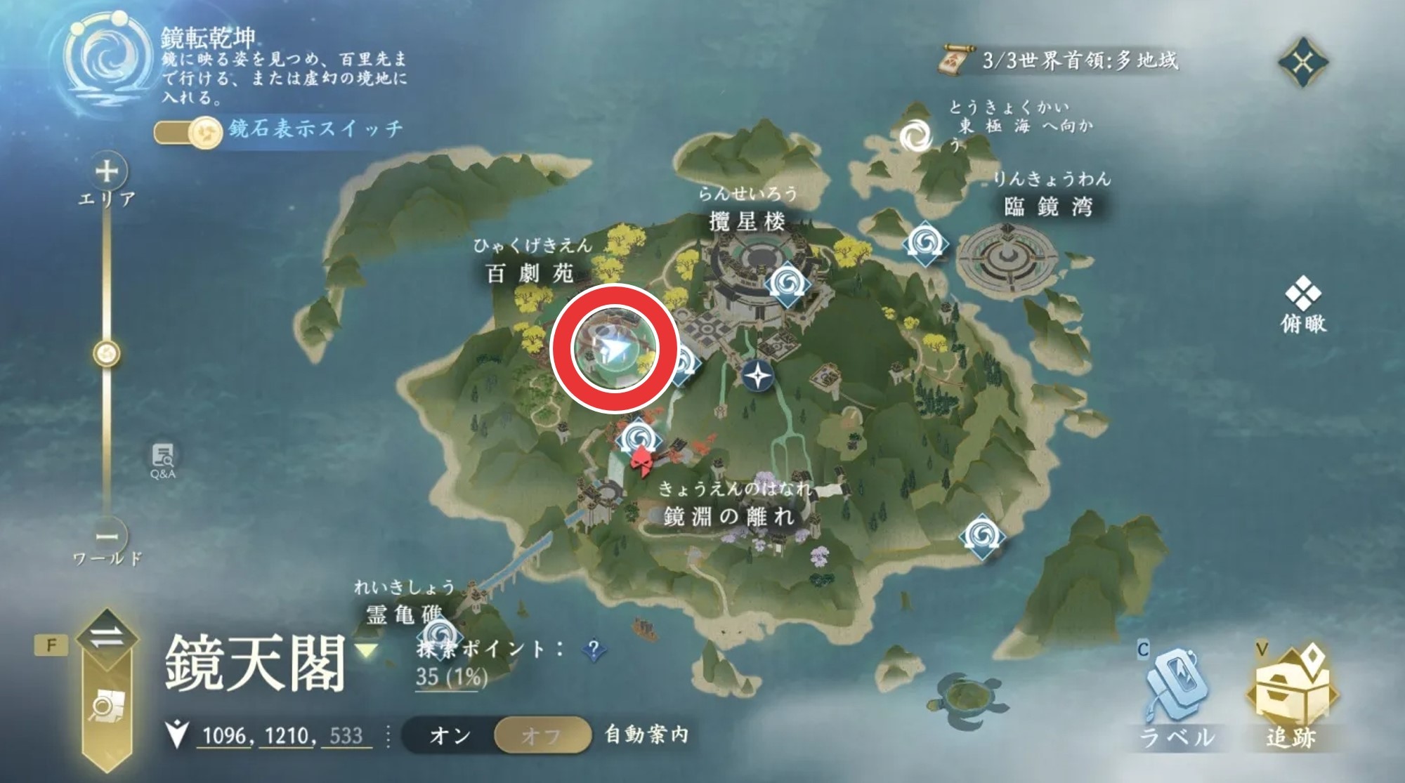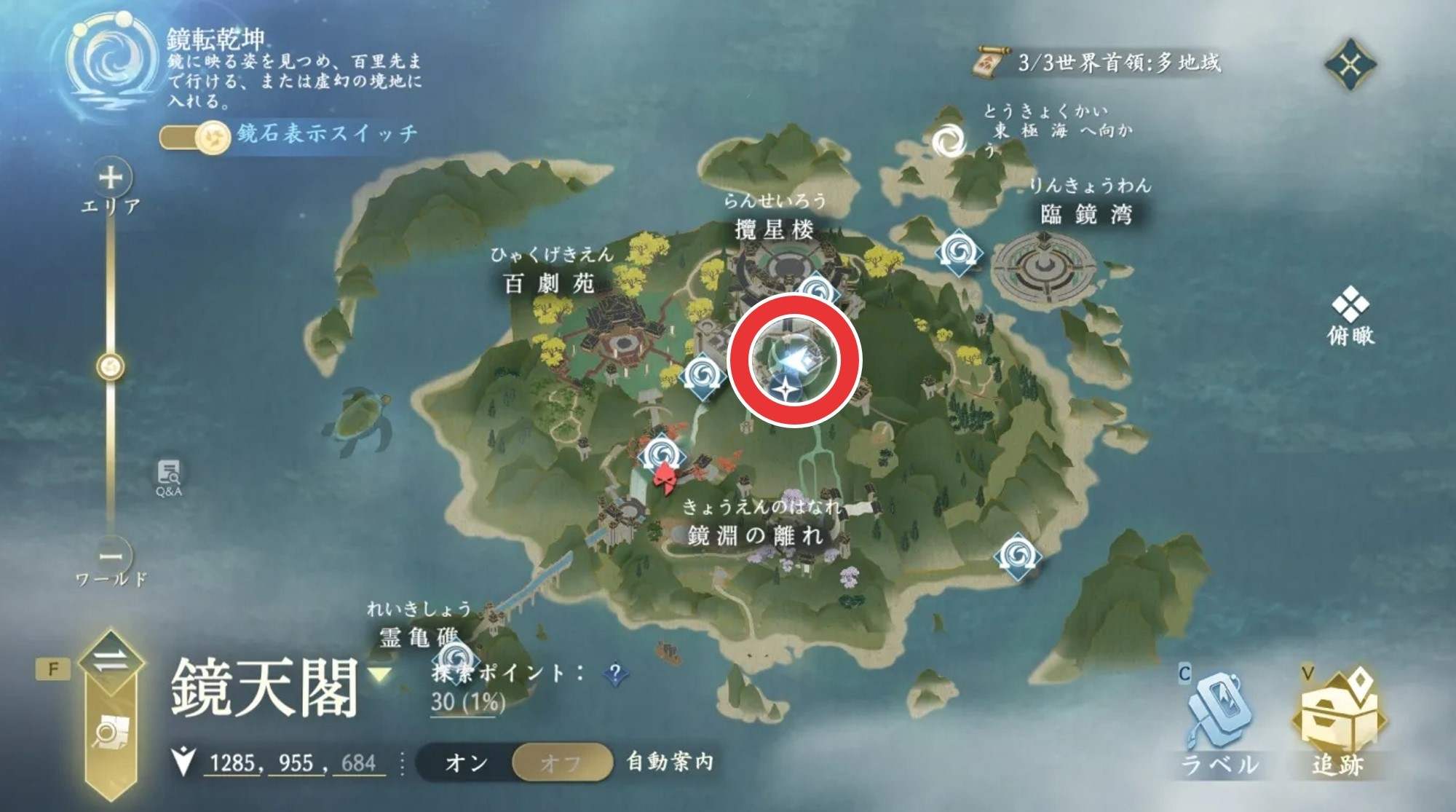 鏡天閣には、転送ポイントや探索コンテンツが用意されています。鏡を通じて現実世界と幻境世界を行きして謎を解いたり宝箱を開封するギミックが多数用意されているため、探索に行き詰ったら鏡に触れてみましょう。