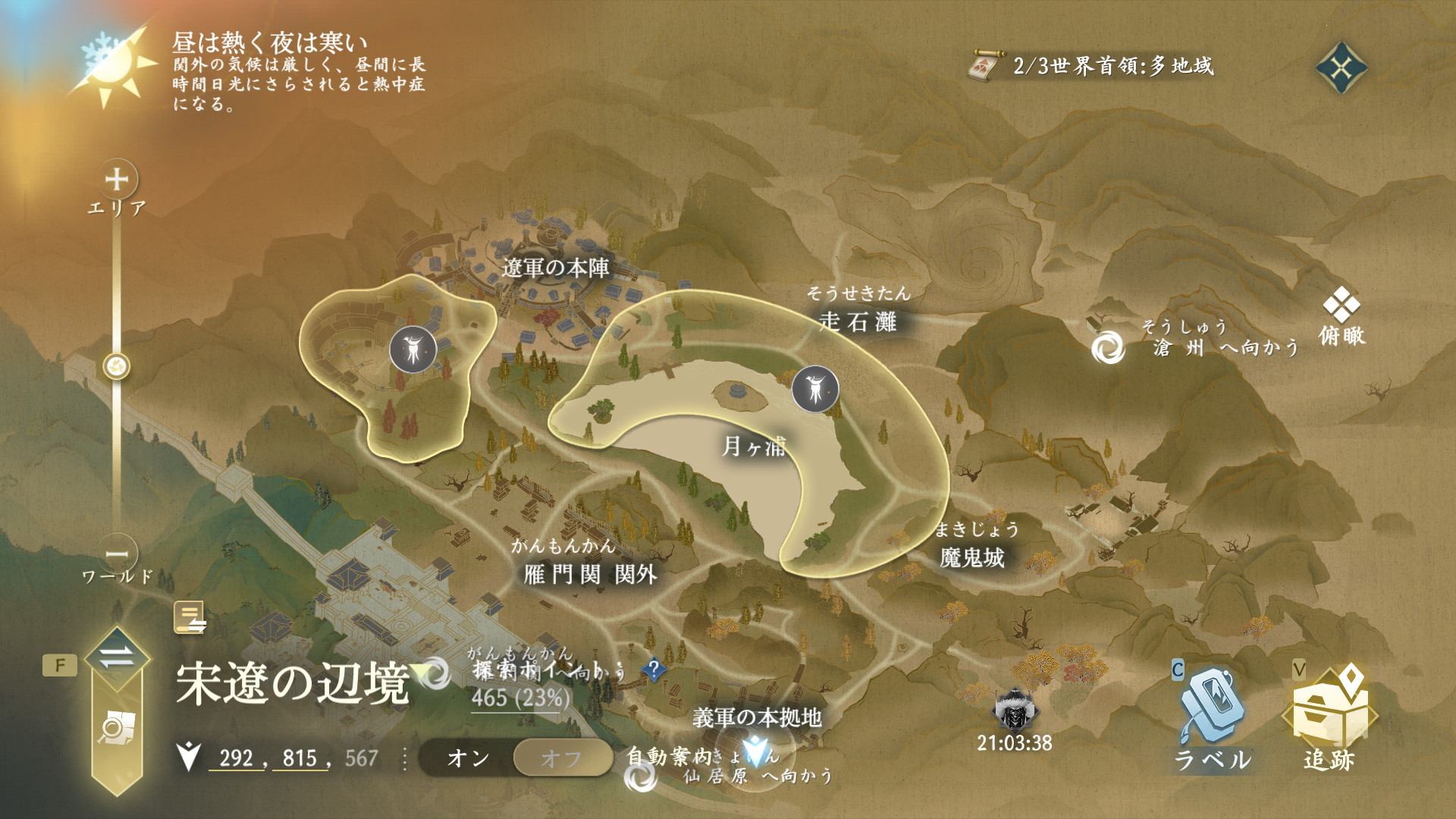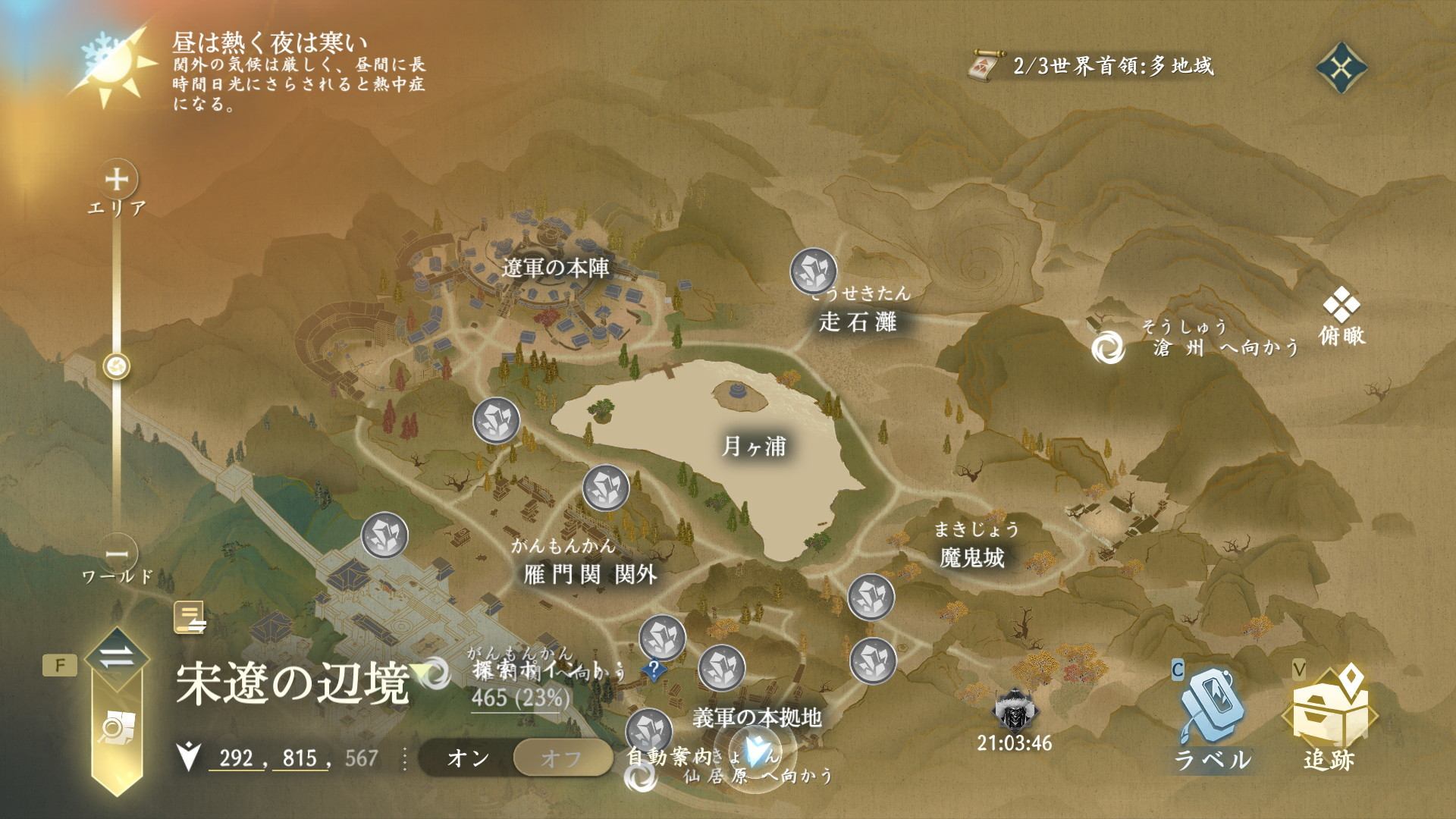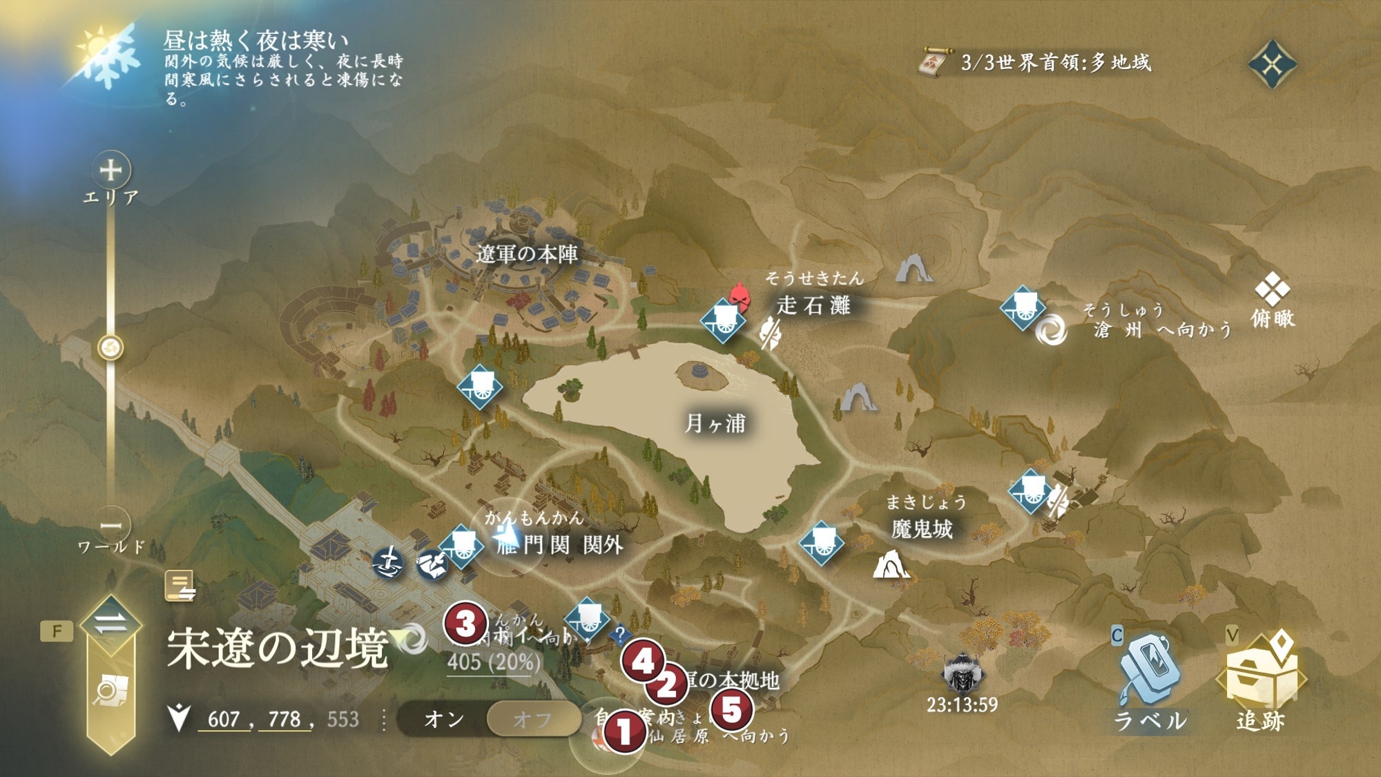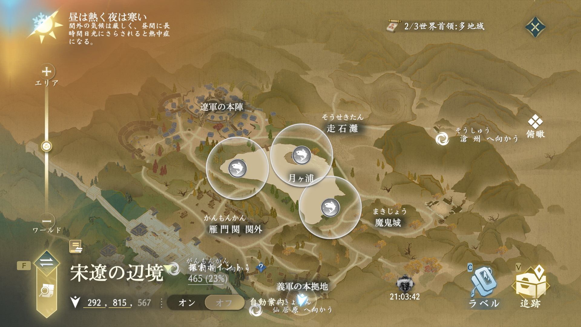 宋遼の辺境では、転送スポットや江湖掲示板、探索要素が用意されています。宋遼の辺境は、昼は暑く夜は寒いマップのため、暑気払いの三白散などのアイテムで対策しましょう。