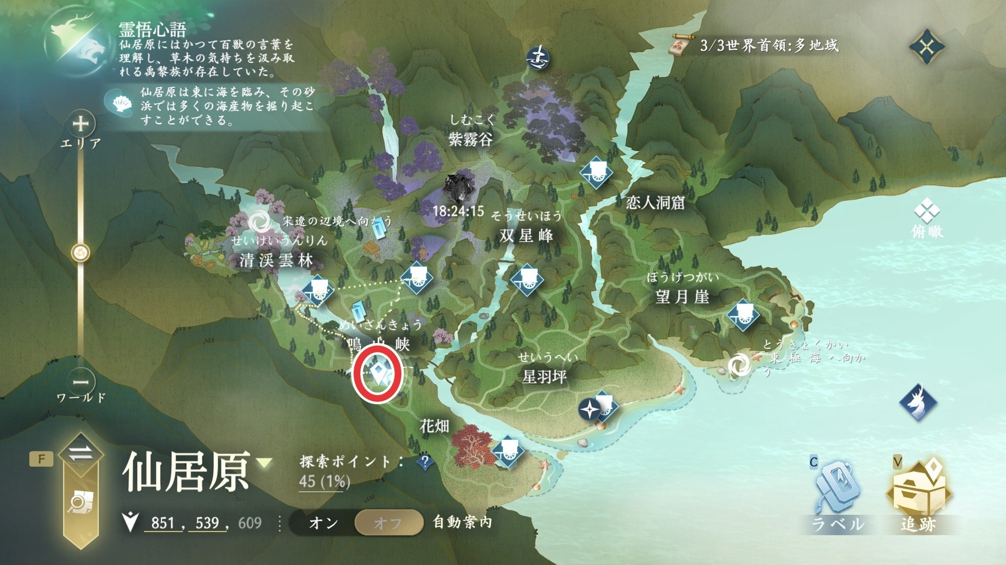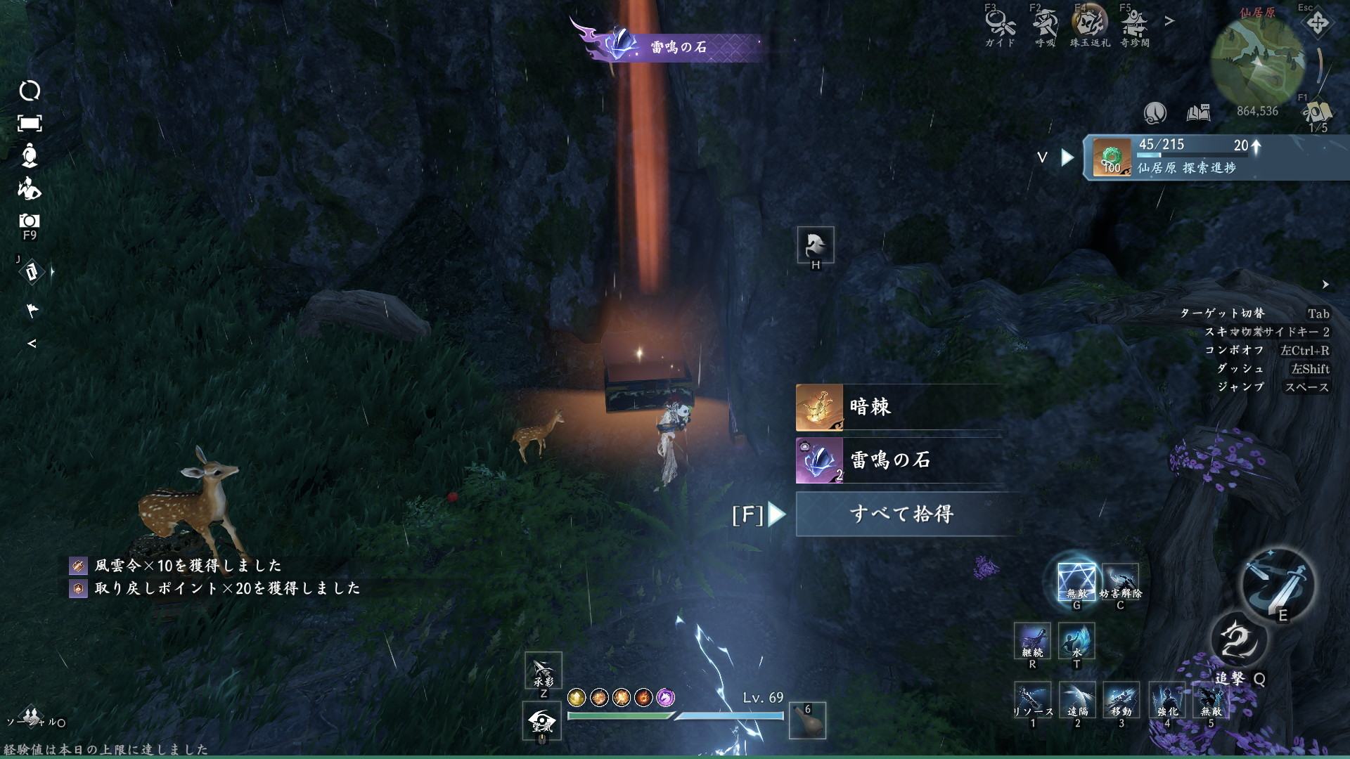 雷鳴の石は、仙居原の探索任務「神鹿の恵」クリアでも獲得できます。神鹿の恵は仙居原(851,539)で、鹿を台座に3匹集めるとクリアできるため、騎乗できる鹿を探して台座まで連れて行きましょう。