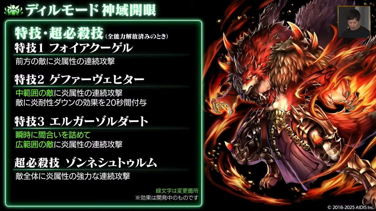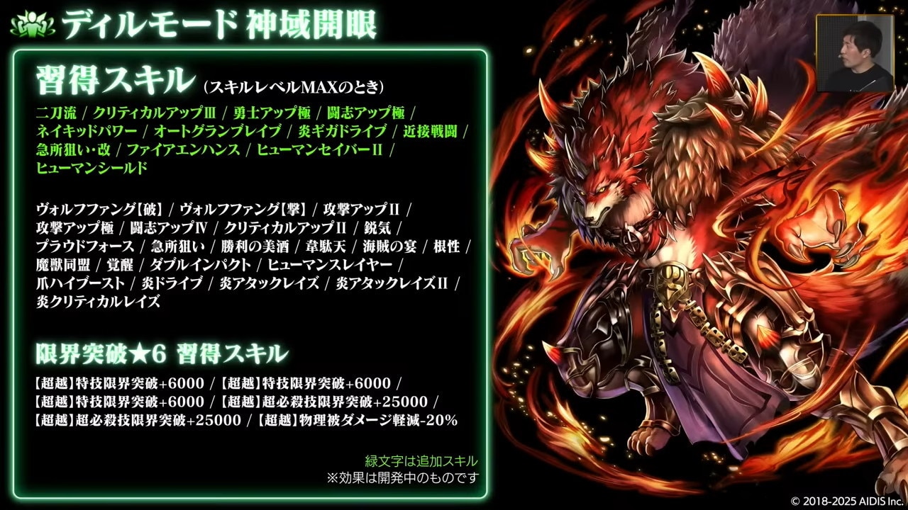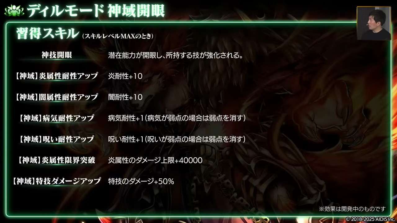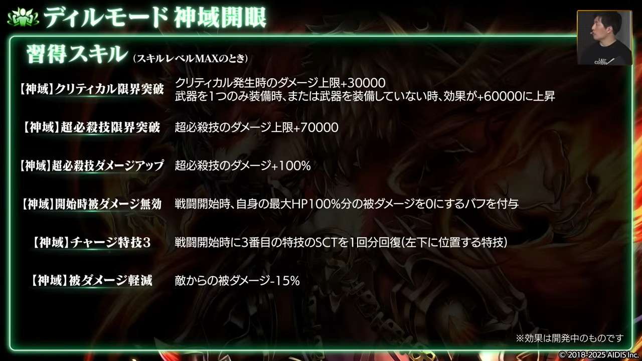 ディルモードに神域開眼が追加されます。特技の性能が変化するだけでなく、クリティカル・超必殺技のダメージ上限アップに加え、最大HP100%分の被ダメージを0にする強力な神域スキルを習得可能です。