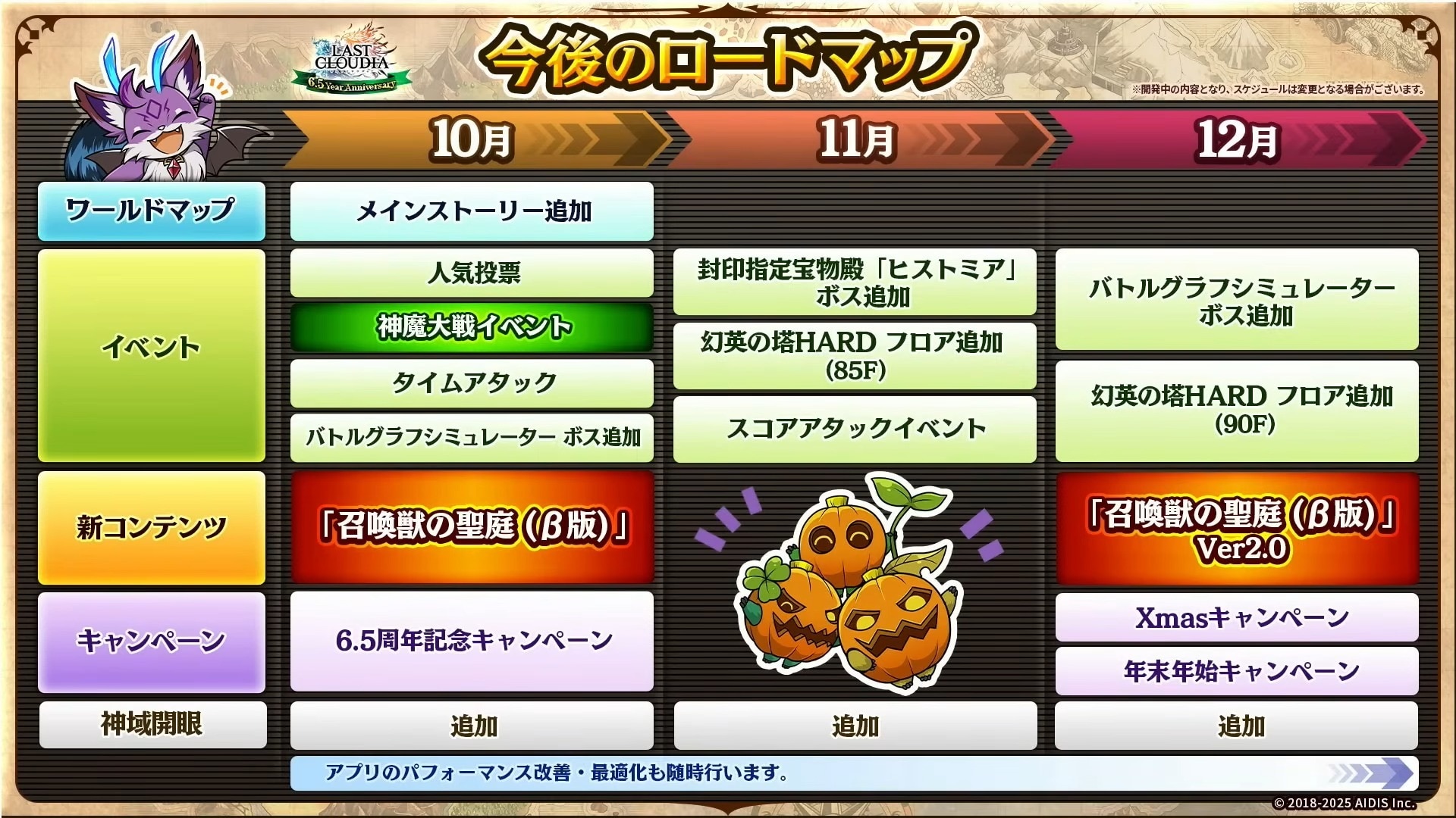 10月には6.5周年の新コンテンツ「召喚獣の聖庭(β版)」、11月にはヒストミアのボス追加、そして12月には召喚獣の聖庭(β版)のアップデートで、楽しみ続けられるスケジュールが待っているようです!