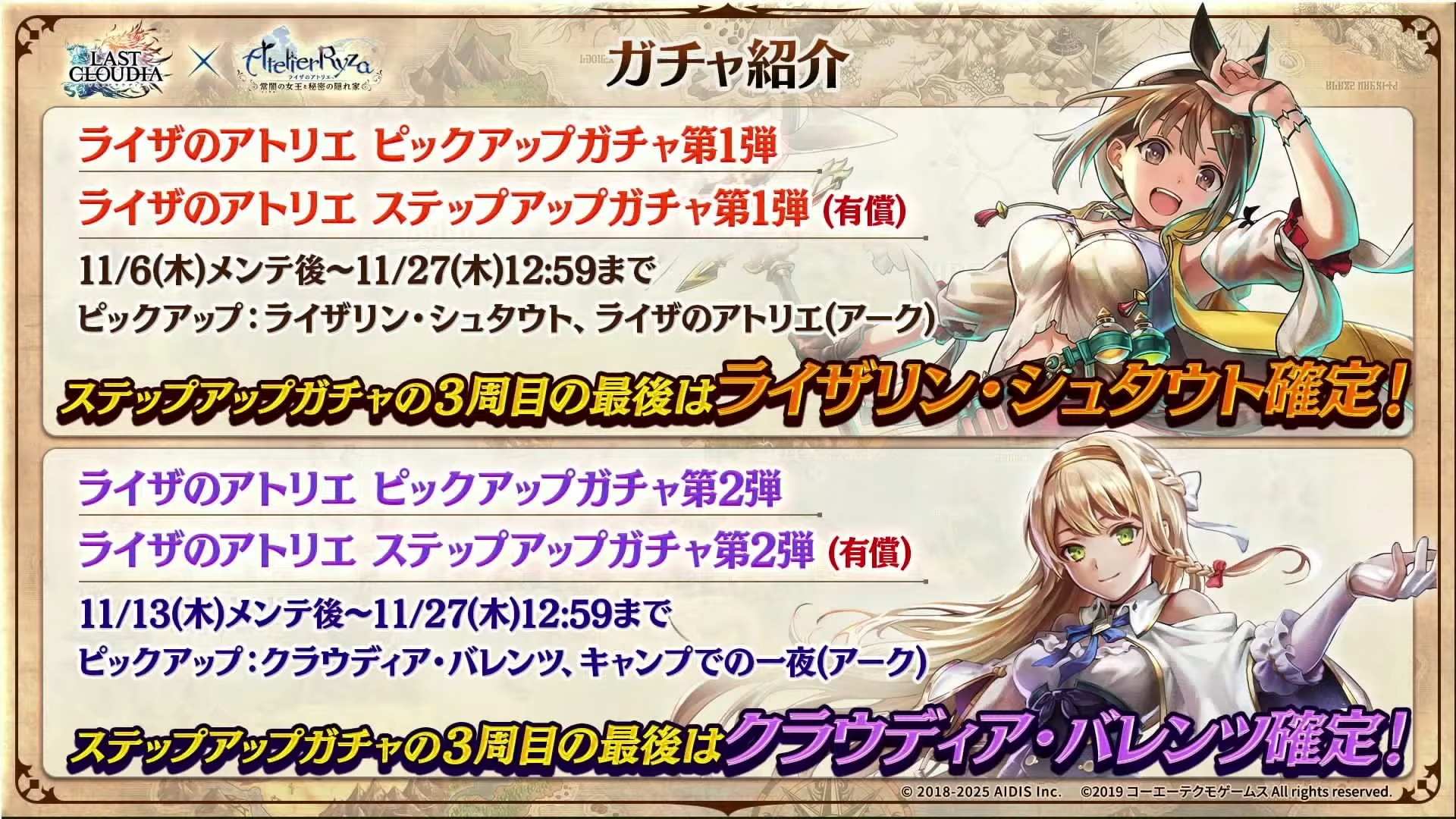 ライザのアトリエコラボでは、前半にライザ、後半にクラウディアのガチャが開催されます。ステップアップガチャでは、3周目の最後にキャラを確定入手できるので、どうしても確保したい場合は天井と併せて活用しましょう。