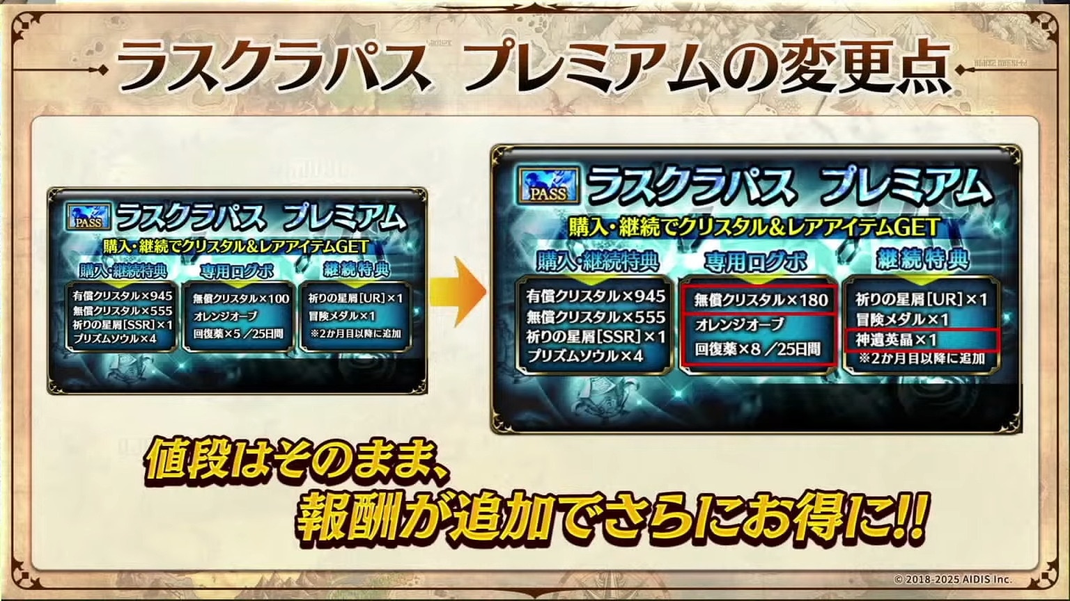 ラスクラプレミアムパスが改善予定です。値段は変わらず、報酬が大幅に増加したので、よりお得になります。毎月ガチャ20連分のクリスタルを入手できるようになったので、ガチャを多く回したい人は優先的にプレミアムパスを購入しましょう。