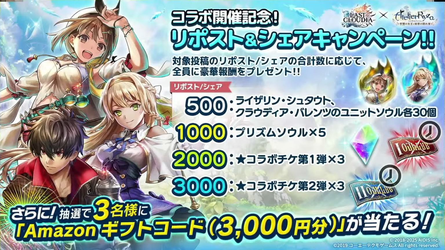 リポスト&シェアキャンペーンが開催予定です。対象ポストのリポスト/シェア合計数に応じて全プレイヤーにアイテムが配られるほか、公式Xをフォローし対象ポストをシェアした人の中から抽選で3名にはAmazonギフトカード(3,000円分)も贈られます。