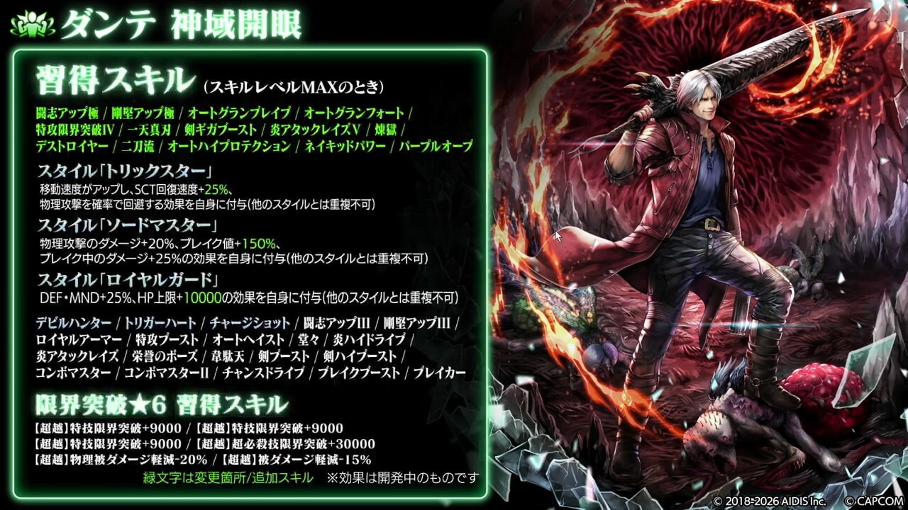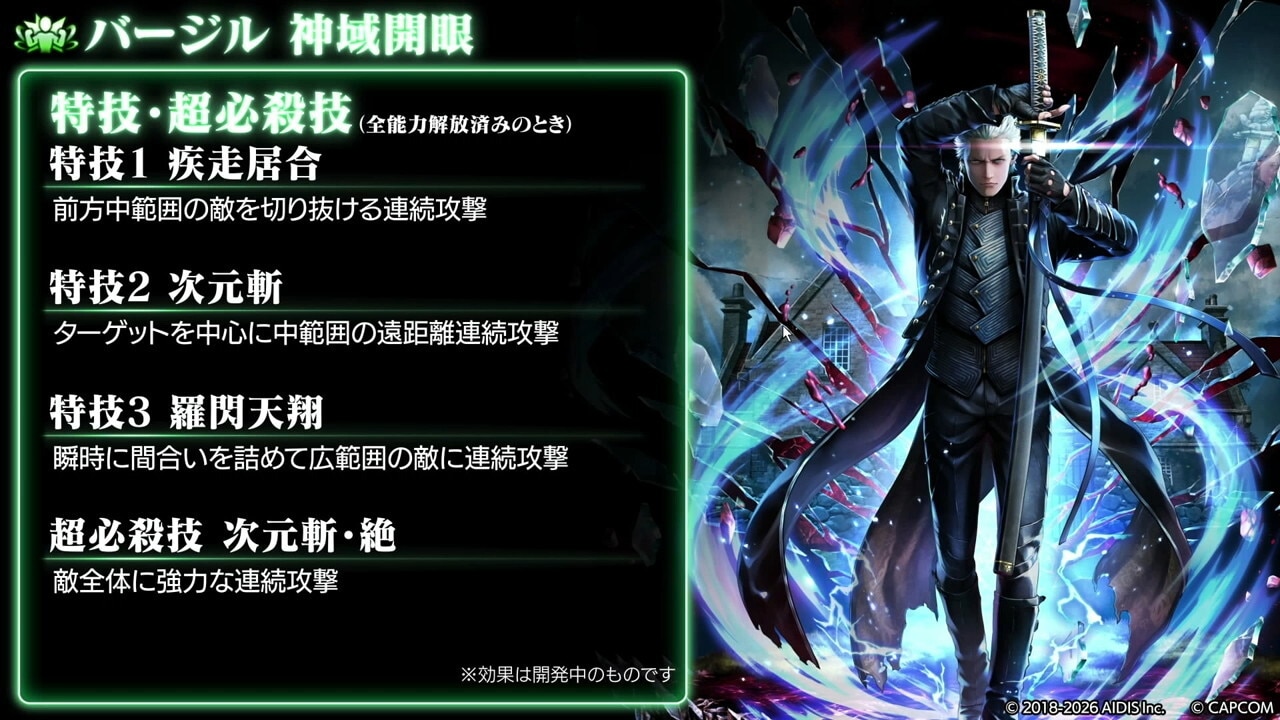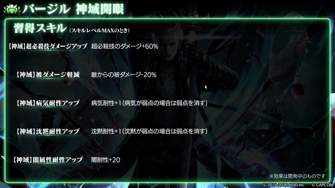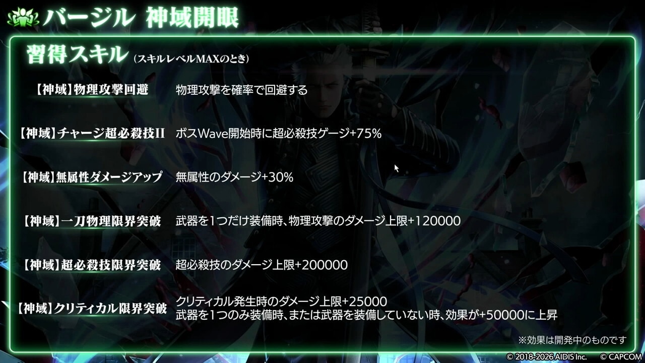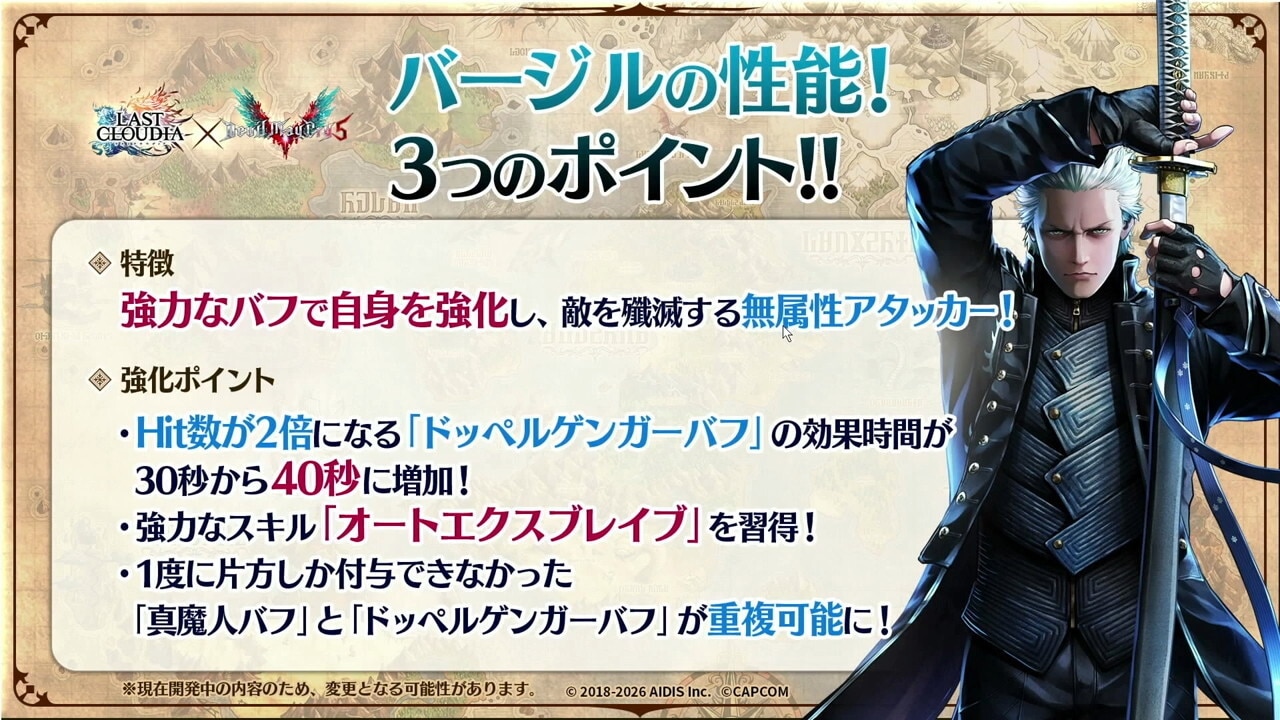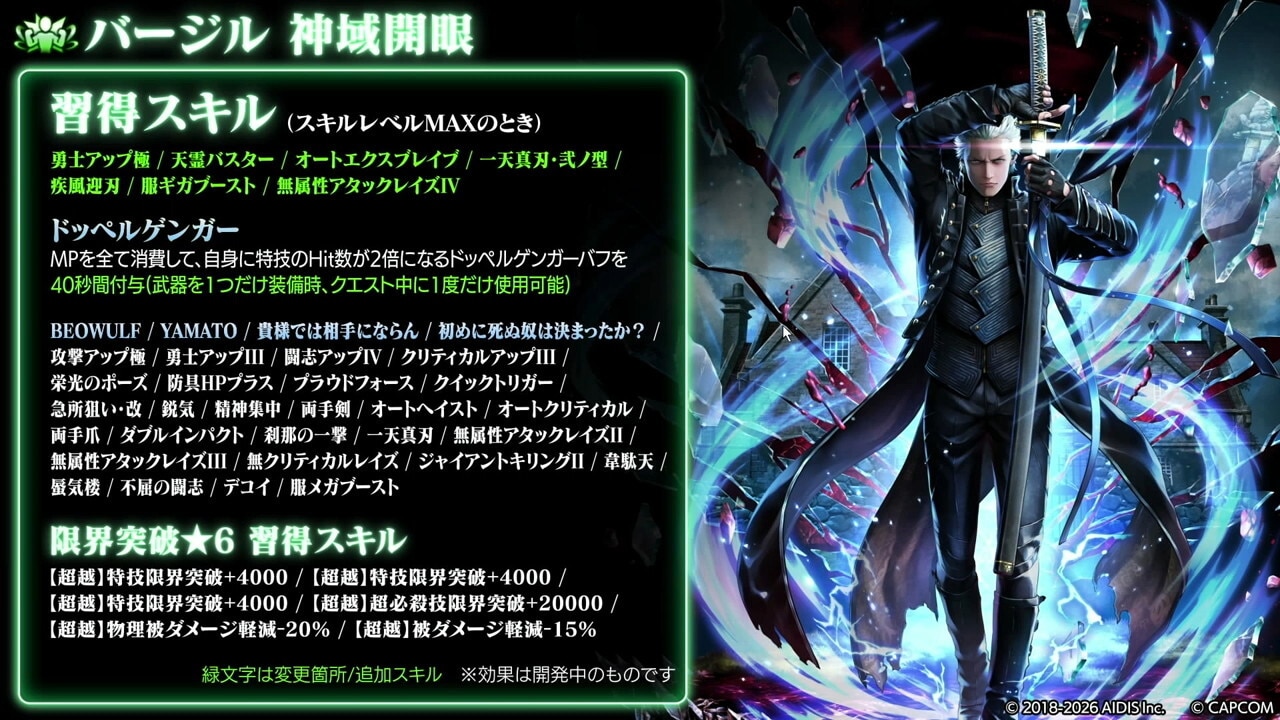 バージルは、瞬間火力が大幅に強化されました。Hit数2倍の固有バフが30秒→40秒に延長されたほか、真魔人バフとドッペルゲンガーバフの重複付与が可能になったので、短時間で大ダメージを与えられます。