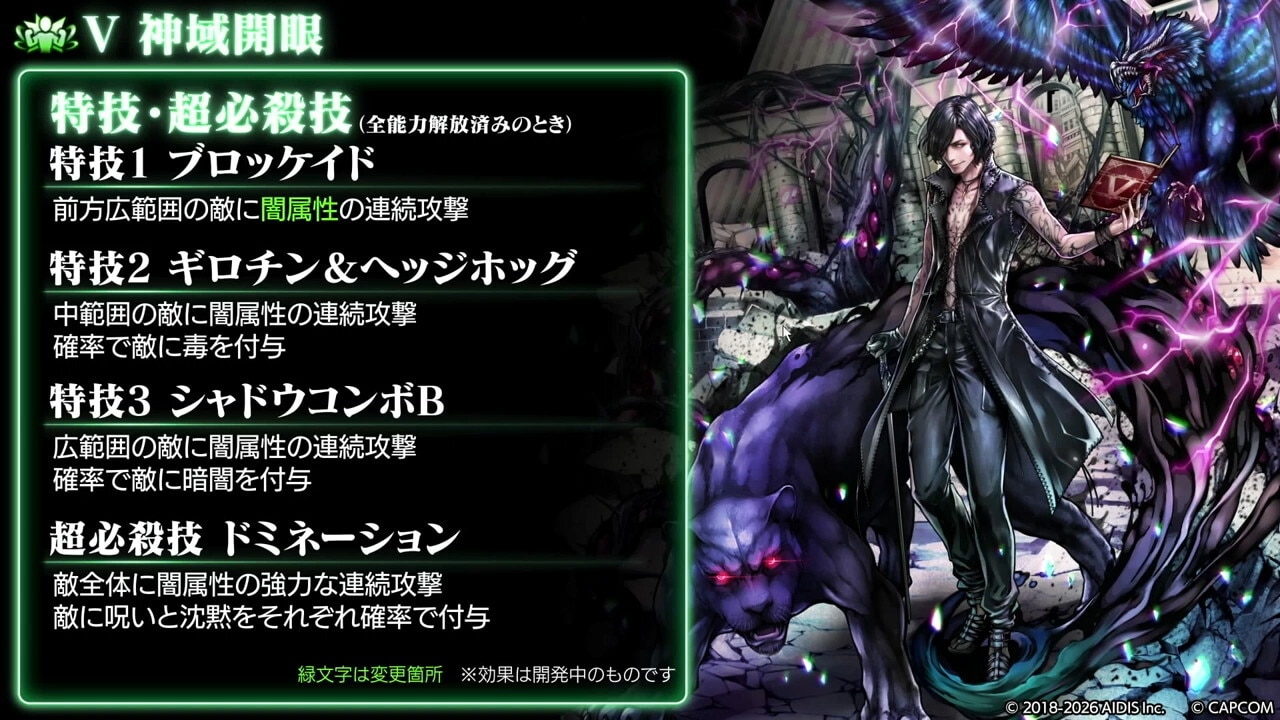 Vは、特技1の属性が雷→闇に変更され、全攻撃が闇属性の扱いやすいキャラになりました。また、開幕から敵の暗闇耐性を2段階も下げられるので、即座に暗闇を付与して物理被ダメージを半減できる点も魅力です。