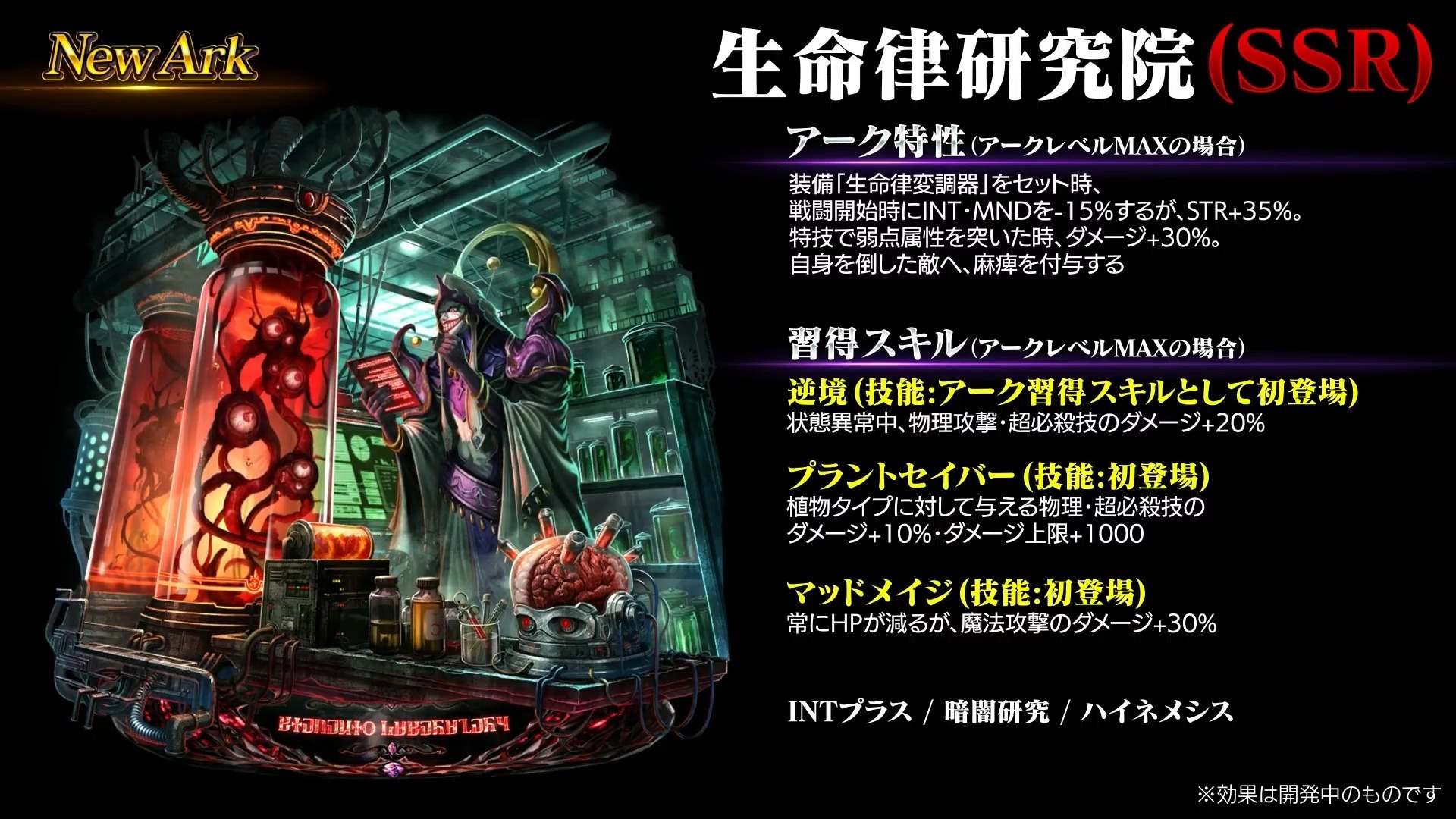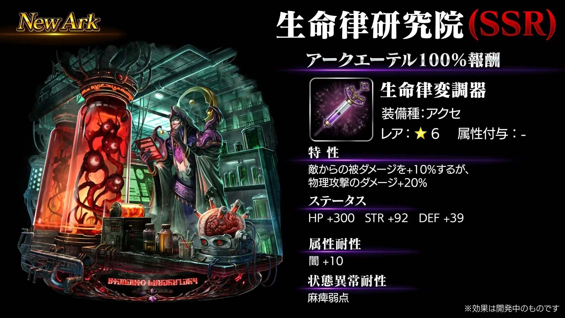 生命律研究院は、SSRながら強力な要素を多く所持しています。特性では死亡時効果とはいえ確定で麻痺を付与できるほか、習得スキルでは魔法キャラ用のバーサーカーを覚えられ、エーテル報酬ではアクセながら20%のダメ増加が可能です。