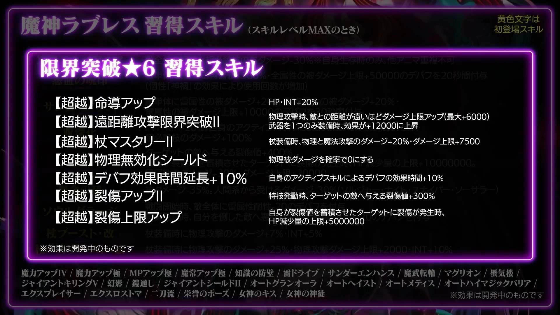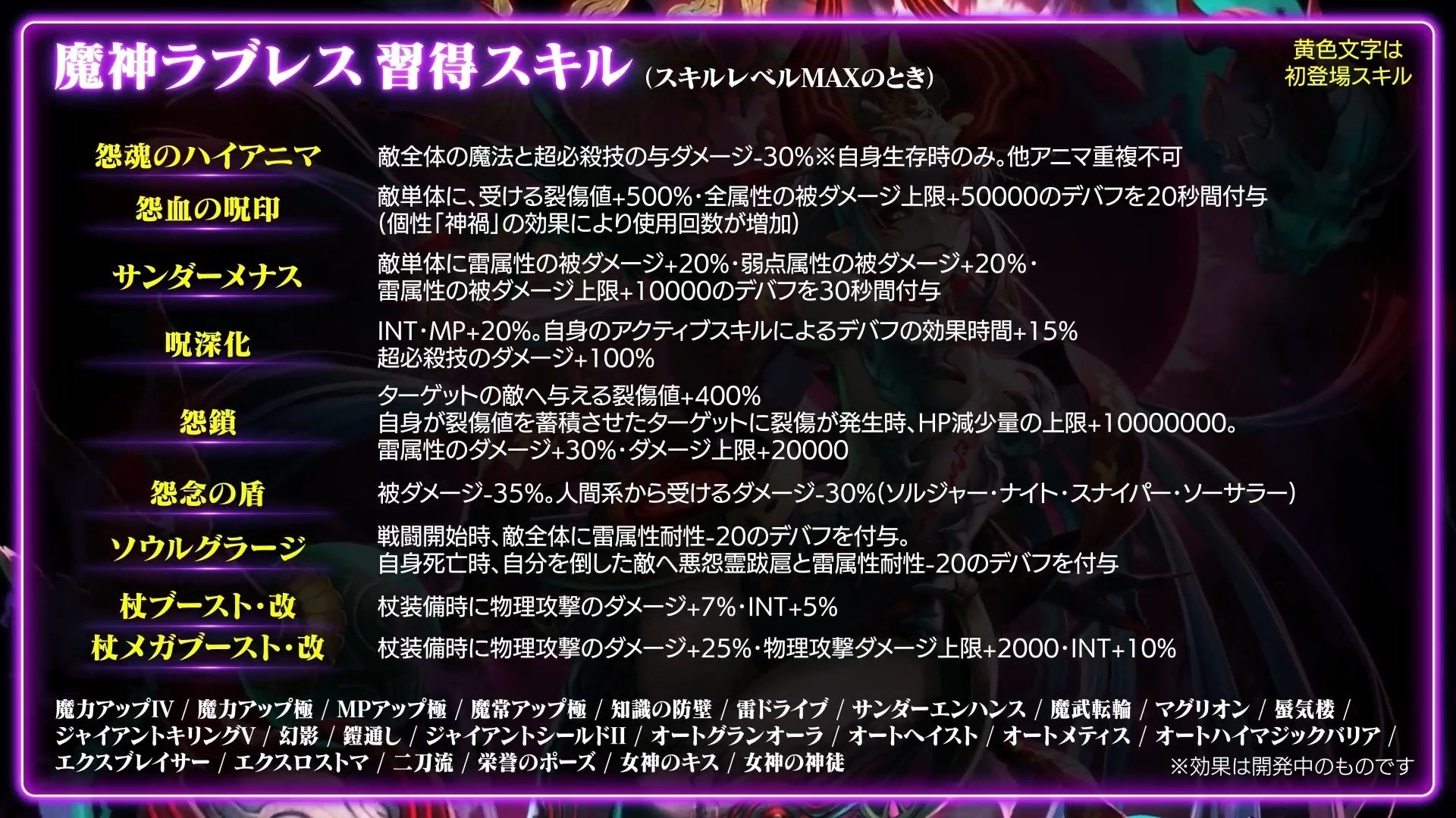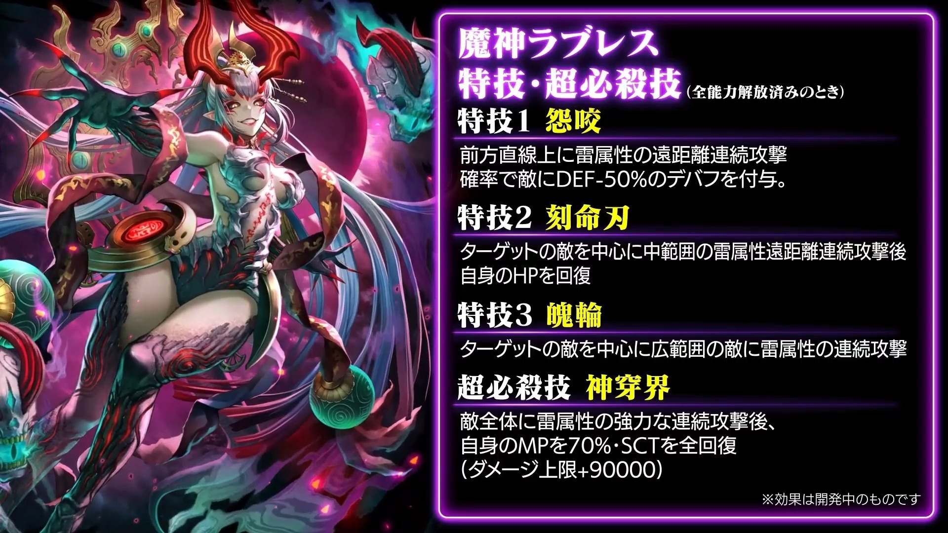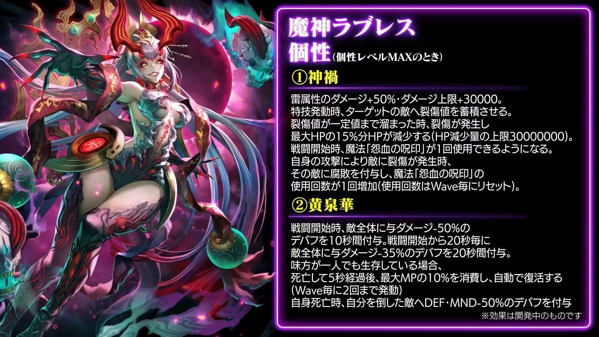 新キャラの魔神ラブレスは、デバフに特化した最強格のサポートキャラです。DEF-50%デバフを始め、サンダーメナスや雷属性耐性ダウンで味方の火力をサポートしつつ、与ダメ低下やSTR・INT-50%デバフで耐久面も強化できます。