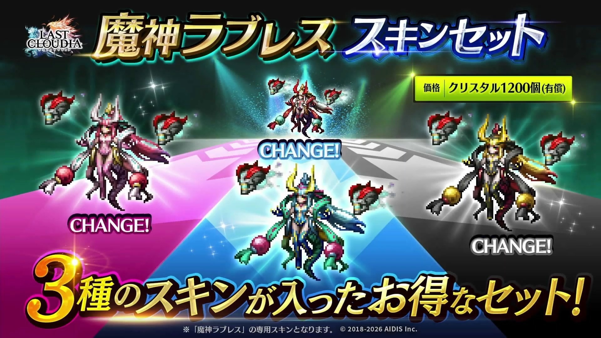魔神ラブレスの実装を記念して、3色のスキンセットが販売されます。販売価格は、有償クリスタル1,200個 (約1,524円)のため、1,500円と160円のパックを購入すると、最安値でスキンを獲得できます。