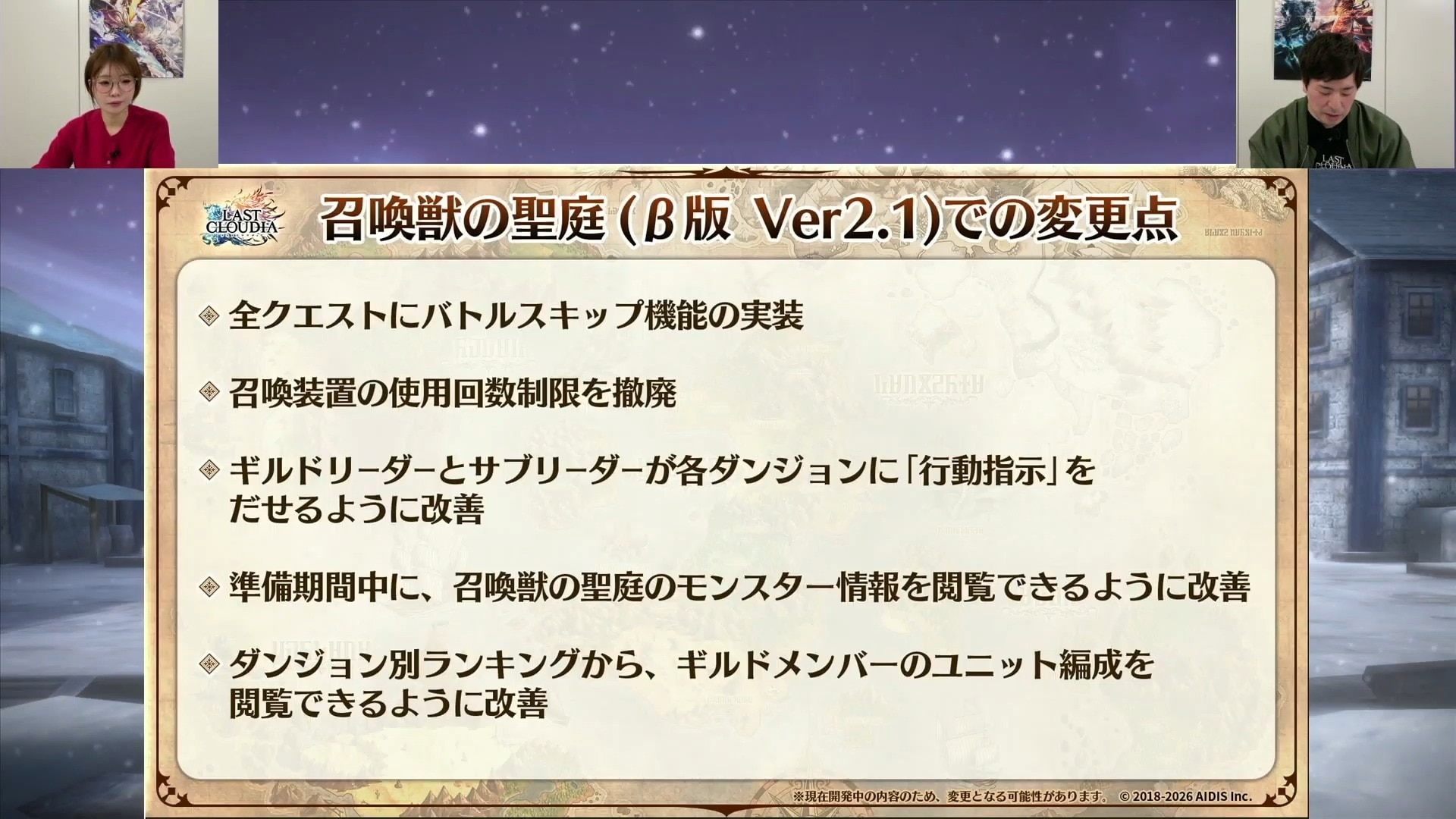 召喚獣の聖庭β版が開催予定です。バトルスキップ機能の追加など、前回に続き複数の改善が行われており、より手軽に遊べるコンテンツとなりました。