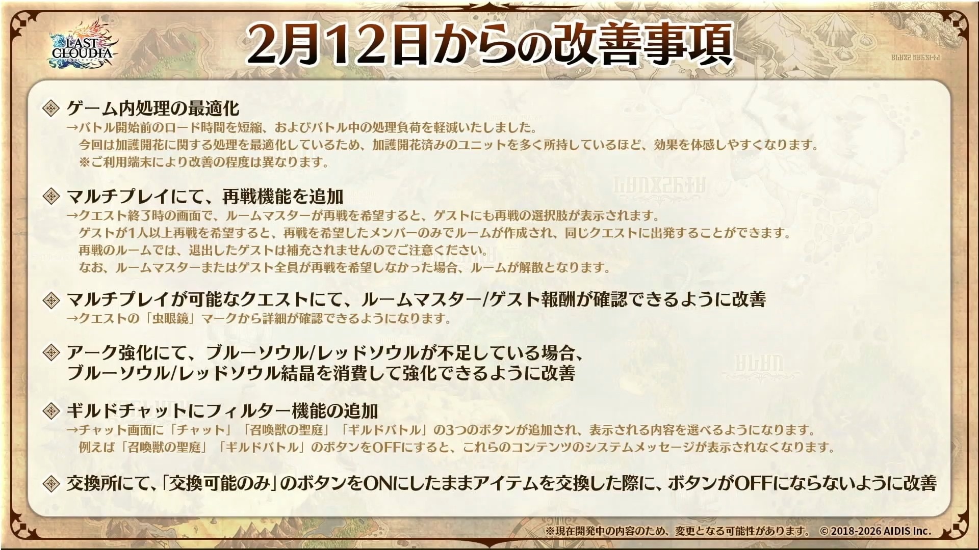 改善事項が複数発表されました。ゲーム内処理の最適化を始め、ブルー・レッドソウル結晶の使いやすさ向上など、細かい部分の調整が行われます。
