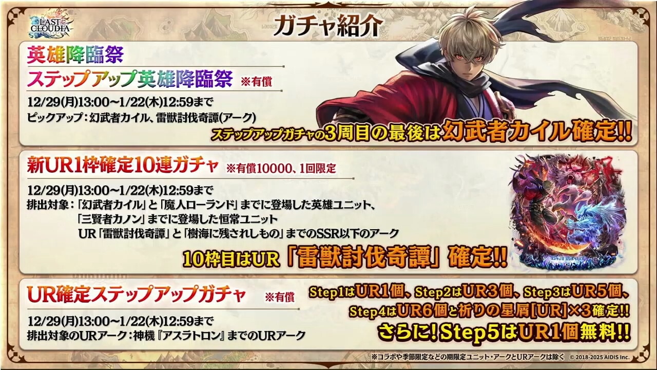 英雄降臨祭ステップアップ ※有償 開催期間 2025/12/29(月)13:00~2026/1/22(木)12:59 詳細 - 3周目の最後は幻武者カイル確定